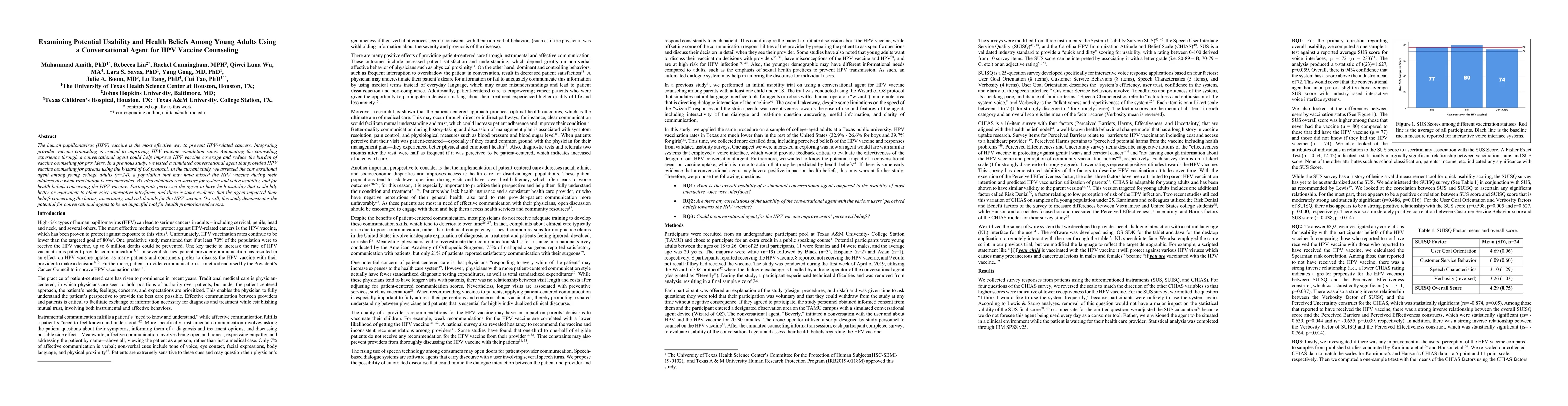 This study evaluates the usability and health beliefs of young adults using a conversational agent for HPV vaccine counseling, finding high perceived usability and some evidence of changed beliefs regarding vaccine risks and benefits. The results suggest conversational agents could enhance HPV vaccine promotion.