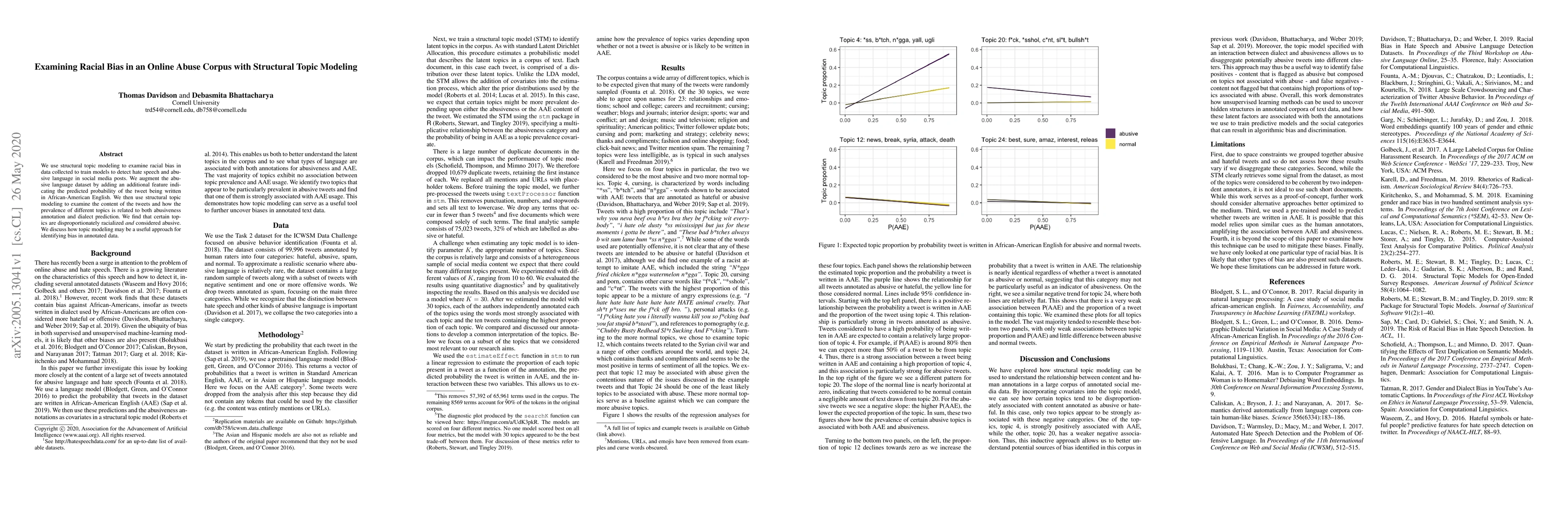 We use structural topic modeling to examine racial bias in data collected to train models to detect hate speech and abusive language in social media posts. We augment the abusive language dataset by adding an additional feature indicating the predicted probability of the tweet being written in African-American English. We then use structural topic modeling to examine the content of the tweets and how the prevalence of different topics is related to both abusiveness annotation and dialect prediction. We find that certain topics are disproportionately racialized and considered abusive. We discuss how topic modeling may be a useful approach for identifying bias in annotated data.