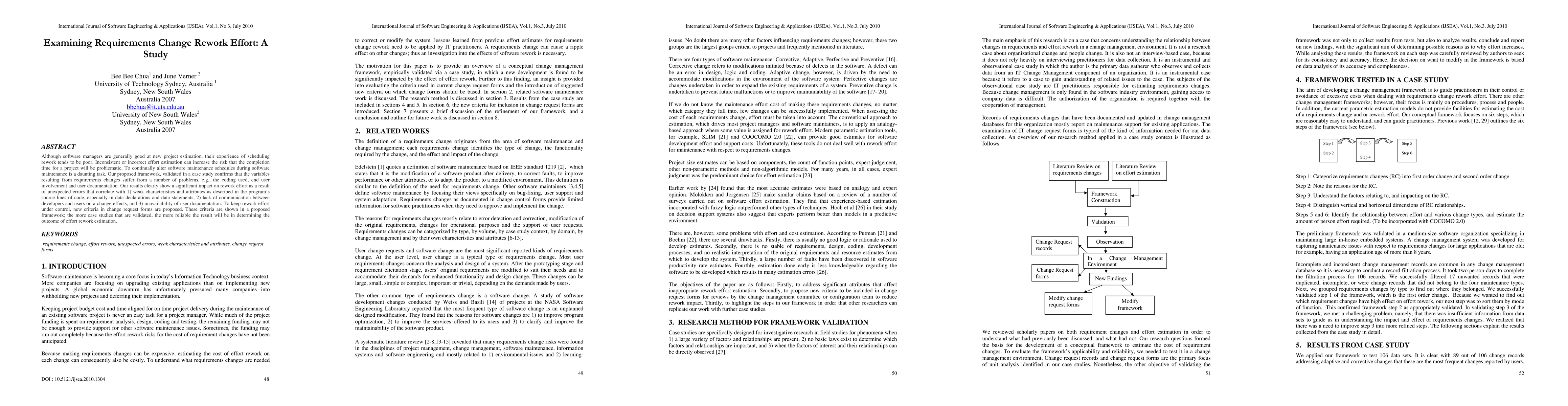 Although software managers are generally good at new project estimation, their experience of scheduling rework tends to be poor. Inconsistent or incorrect effort estimation can increase the risk that the completion time for a project will be problematic. To continually alter software maintenance schedules during software maintenance is a daunting task. Our proposed framework, validated in a case study confirms that the variables resulting from requirements changes suffer from a number of problems, e.g., the coding used, end user involvement and user documentation. Our results clearly show a significant impact on rework effort as a result of unexpected errors that correlate with 1) weak characteristics and attributes as described in the program's source lines of code, especially in data declarations and data statements, 2) lack of communication between developers and users on a change effects, and 3) unavailability of user documentation. To keep rework effort under control, new criteria in change request forms are proposed. These criteria are shown in a proposed framework; the more case studies that are validated, the more reliable the result will be in determining the outcome of effort rework estimation.
