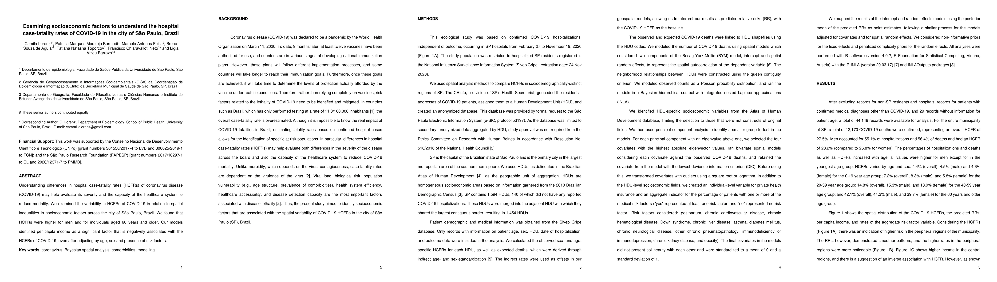 This study investigates how socioeconomic factors influence hospital case-fatality rates (HCFRs) of COVID-19 in Sao Paulo, Brazil. Higher HCFRs were observed in older men and lower per capita income areas were linked to increased mortality, highlighting the role of socioeconomic disparities in COVID-19 outcomes.