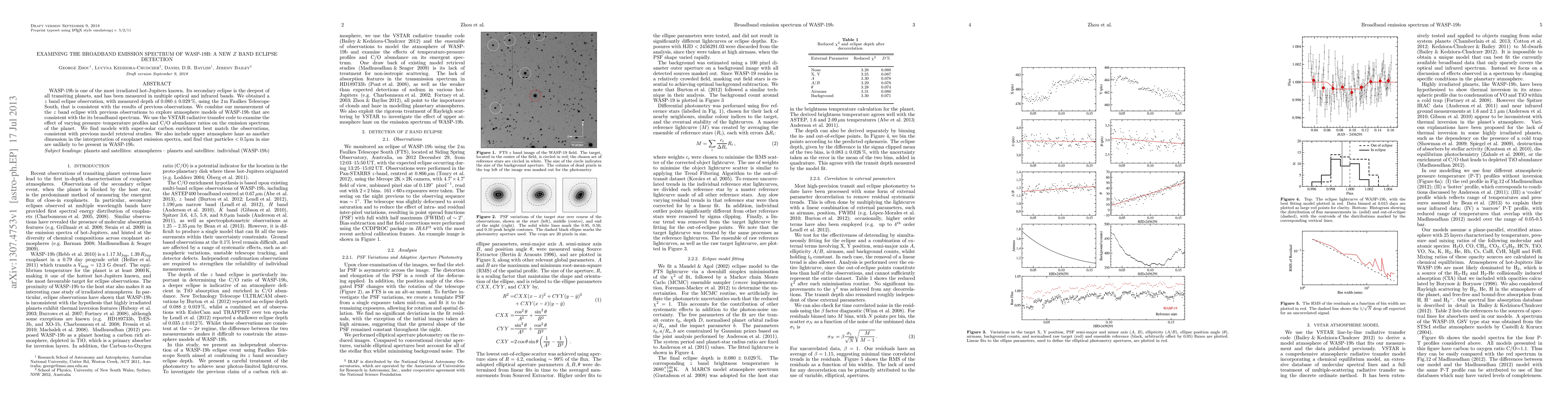 This paper reports a new z band eclipse detection for the hot-Jupiter WASP-19b, revealing a secondary eclipse depth consistent with previous observations. The study uses the VSTAR code to model the planet's broadband emission spectrum, finding that super-solar carbon enrichment and the absence of small haze particles best fit the observed data.