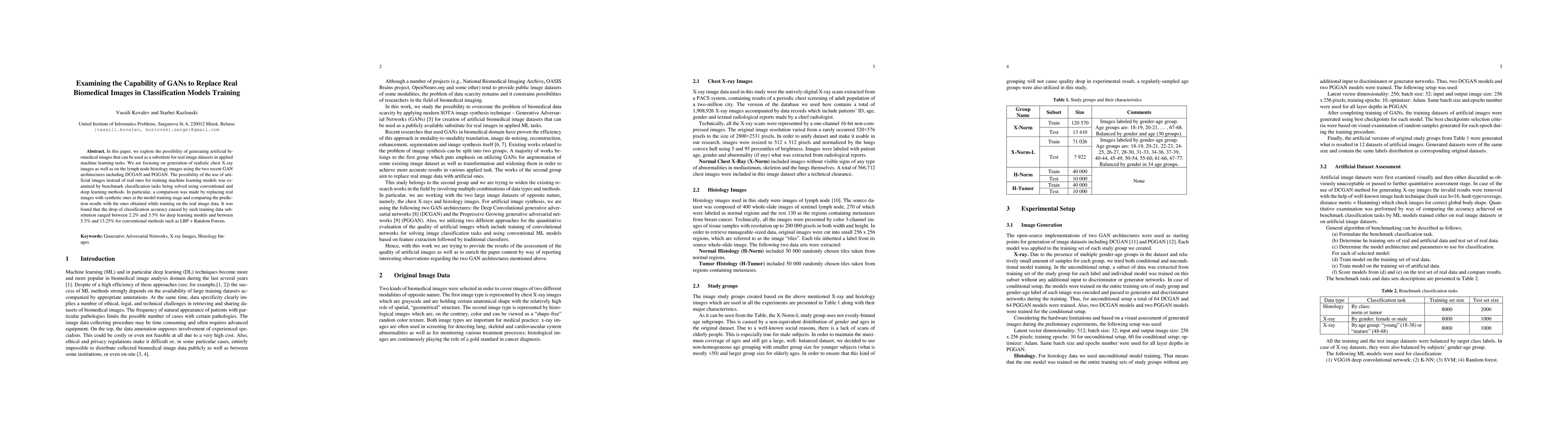 Researchers explored using Generative Adversarial Networks (GANs) to generate realistic biomedical images for machine learning model training, finding that synthetic images result in a 2-13% drop in accuracy compared to real images.