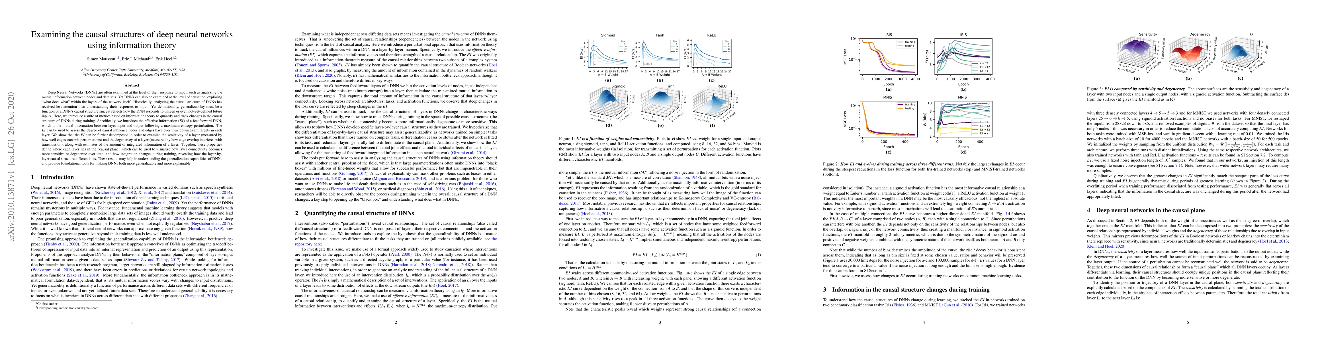 Deep Neural Networks (DNNs) are often examined at the level of their response to input, such as analyzing the mutual information between nodes and data sets. Yet DNNs can also be examined at the level of causation, exploring "what does what" within the layers of the network itself. Historically, analyzing the causal structure of DNNs has received less attention than understanding their responses to input. Yet definitionally, generalizability must be a function of a DNN's causal structure since it reflects how the DNN responds to unseen or even not-yet-defined future inputs. Here, we introduce a suite of metrics based on information theory to quantify and track changes in the causal structure of DNNs during training. Specifically, we introduce the effective information (EI) of a feedforward DNN, which is the mutual information between layer input and output following a maximum-entropy perturbation. The EI can be used to assess the degree of causal influence nodes and edges have over their downstream targets in each layer. We show that the EI can be further decomposed in order to examine the sensitivity of a layer (measured by how well edges transmit perturbations) and the degeneracy of a layer (measured by how edge overlap interferes with transmission), along with estimates of the amount of integrated information of a layer. Together, these properties define where each layer lies in the "causal plane" which can be used to visualize how layer connectivity becomes more sensitive or degenerate over time, and how integration changes during training, revealing how the layer-by-layer causal structure differentiates. These results may help in understanding the generalization capabilities of DNNs and provide foundational tools for making DNNs both more generalizable and more explainable.