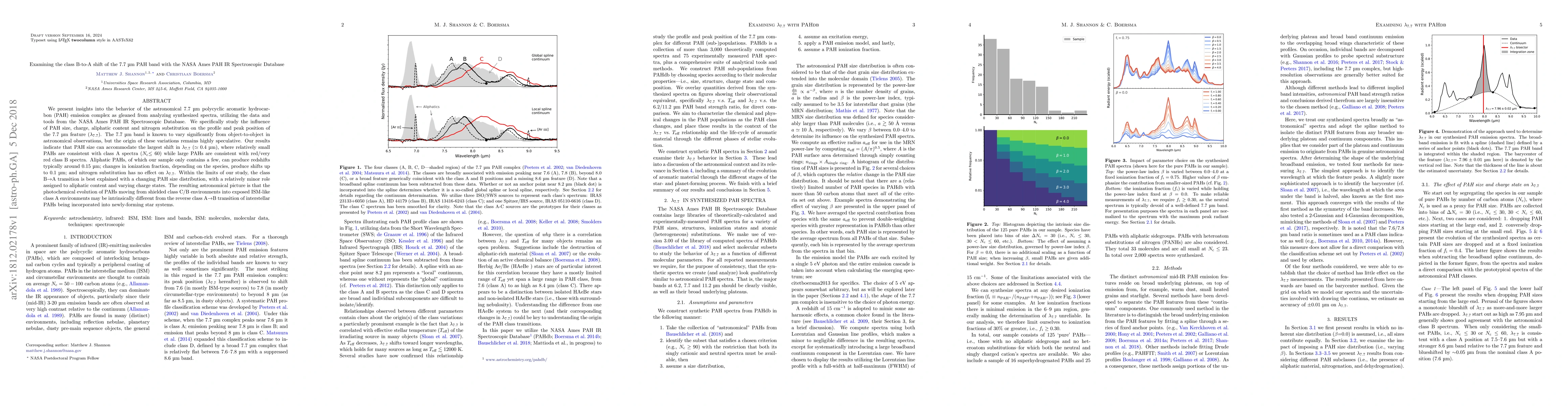 This study analyzes the 7.7 μm PAH emission band using the NASA Ames PAH IR Spectroscopic Database, finding that PAH size significantly influences the band's shift, with large PAHs correlating to class B spectra and small PAHs to class A. The study suggests that the class B-to-A transition is primarily driven by changes in PAH size distribution, with minor contributions from aliphatic content and charge states.