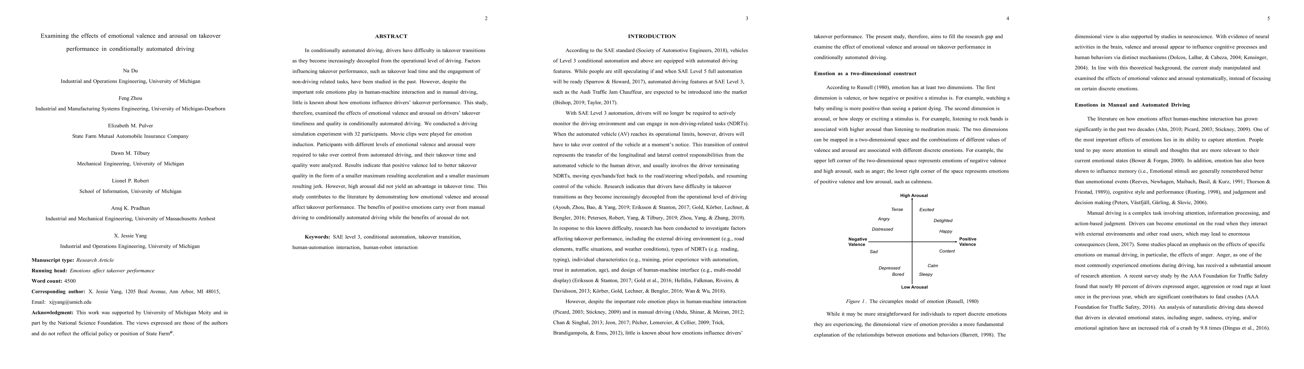 This study explores how emotional valence and arousal impact drivers' takeover performance in conditionally automated driving. Results show that positive emotional valence enhances takeover quality, while high arousal does not improve takeover time.