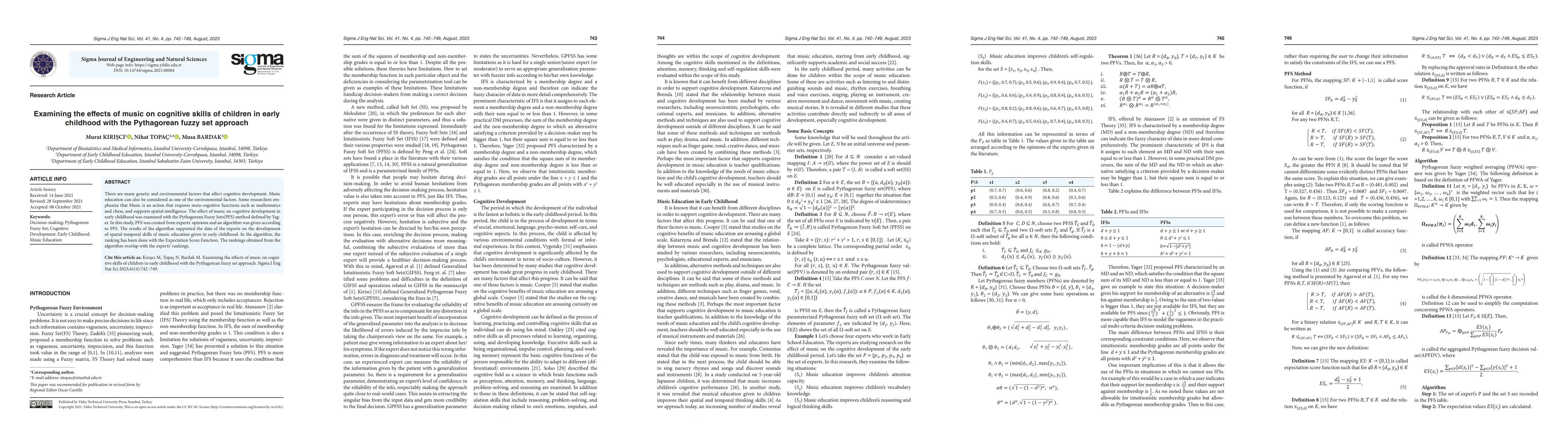 There are many genetic and environmental factors that affect cognitive development. Music education can also be considered as one of the environmental factors. Some researchers emphasize that Music is an action that requires meta-cognitive functions such as mathematics and chess and supports spatial intelligence. The effect of Music on cognitive development in early childhood was examined using the Pythagorean Fuzzy Sets(PFS) method defined by Yager. This study created PFS based on experts' opinions, and an algorithm was given according to PFS. The algorithm's results supported the experts' data on the development of spatial-temporal skills in music education given in early childhood. The algorithm's ranking was done using the Expectation Score Function. The rankings obtained from the algorithm overlap with the experts' rankings.