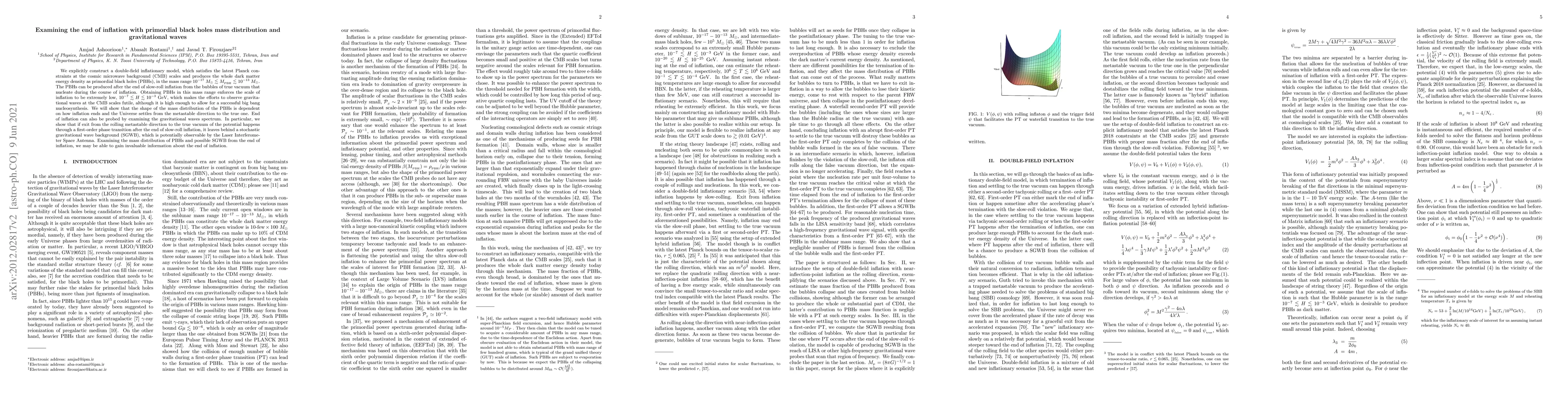 We explicitly construct a double-field inflationary model, which satisfies the latest Planck constraints at the cosmic microwave background (CMB) scales and produces the whole dark matter energy density as primordial black holes (PBHs), in the mass range $10^{-17}~M_{\odot}\lesssim M_{{}_{\rm PBH}}\lesssim 10^{-13}~M_{\odot}$. The PBHs can be produced after the end of slow-roll inflation from the bubbles of true vacuum that nucleate during the course of inflation. Obtaining PBHs in this mass range enforces the scale of inflation to be extremely low, $10^{-7} \lesssim H \lesssim 10^{-3} ~{\rm GeV}$, which makes the efforts to observe gravitational waves at the CMB scales futile, although it is high enough to allow for a successful big bang nucleosynthesis. We will show that the shape of the mass distribution of the PBHs is dependent on how inflation ends and the Universe settles from the metastable direction to the true one. End of inflation can also be probed by examining the gravitational waves spectrum. In particular, we show that if exit from the rolling metastable direction to the true vacuum of the potential happens through a first-order phase transition after the end of slow-roll inflation, it leaves behind a stochastic gravitational wave background (SGWB), which is potentially observable by the Laser Interferometer Space Antenna. Examining the mass distribution of PBHs and possible SGWB from the end of inflation, we may be able to gain invaluable information about the end of inflation.