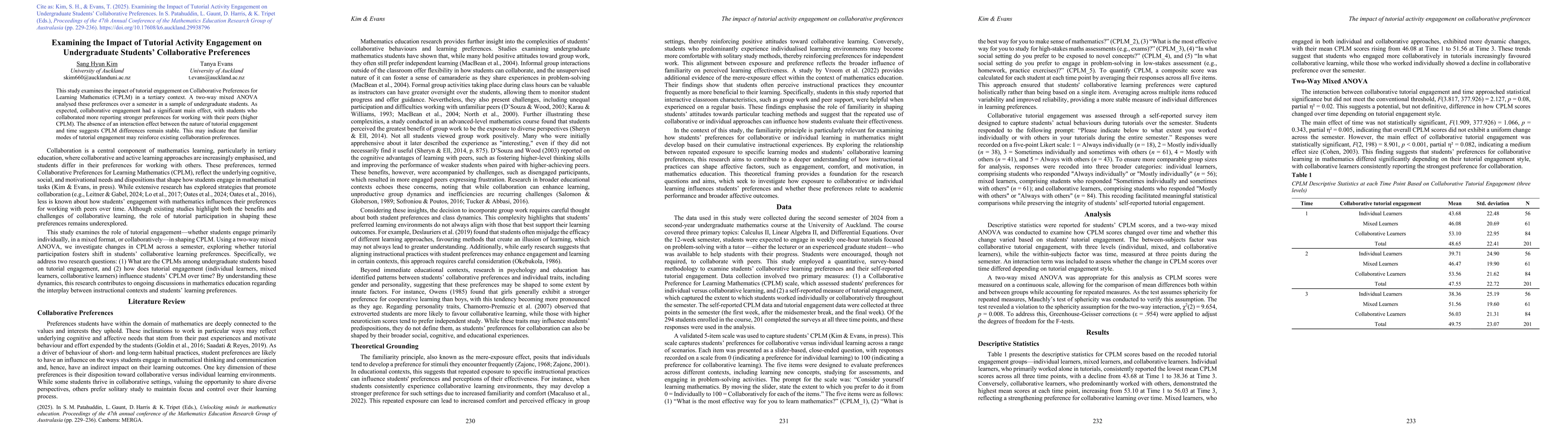 This study examines the impact of tutorial engagement on Collaborative Preferences for Learning Mathematics (CPLM) in a tertiary context. A two-way mixed ANOVA analysed these preferences over a semester in a sample of undergraduate students. As expected, collaborative engagement had a significant main effect, with students who collaborated more reporting stronger preferences for working with their peers (higher CPLM). The absence of an interaction effect between the nature of tutorial engagement and time suggests CPLM differences remain stable. This may indicate that familiar modes of tutorial engagement may reinforce existing collaboration preferences.
