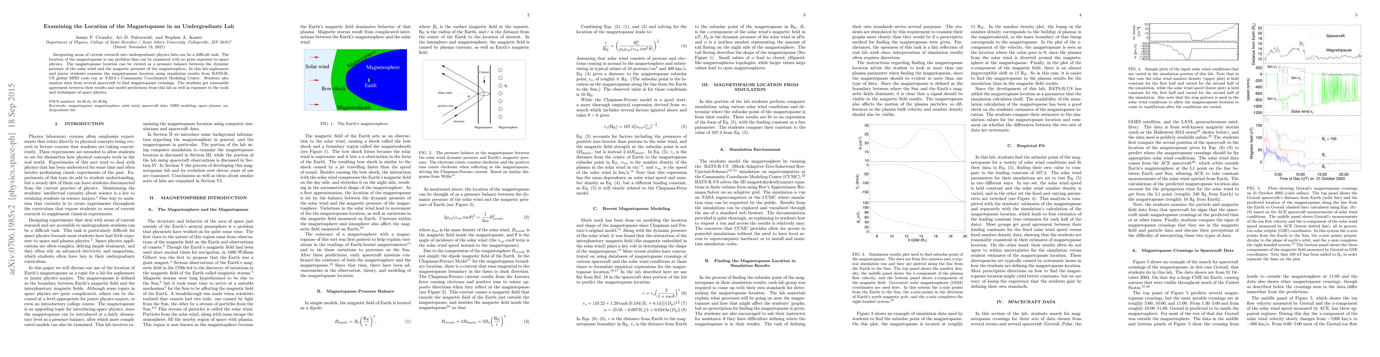 Integrating areas of current research into undergraduate physics labs can be a difficult task. The location of the magnetopause is one problem that can be examined with no prior exposure to space physics. The magnetopause location can be viewed as a pressure balance between the dynamic pressure of the solar wind and the magnetic pressure of the magnetosphere. In this lab sophomore and junior students examine the magnetopause location using simulation results from BATS-R-US global MHD code run at NASA's Community Coordinated Modeling Center. Students also analyze data from several spacecraft to find magnetopause crossings. The students get reasonable agreement between their results and model predictions from this lab as well as exposure to the tools and techniques of space physics.