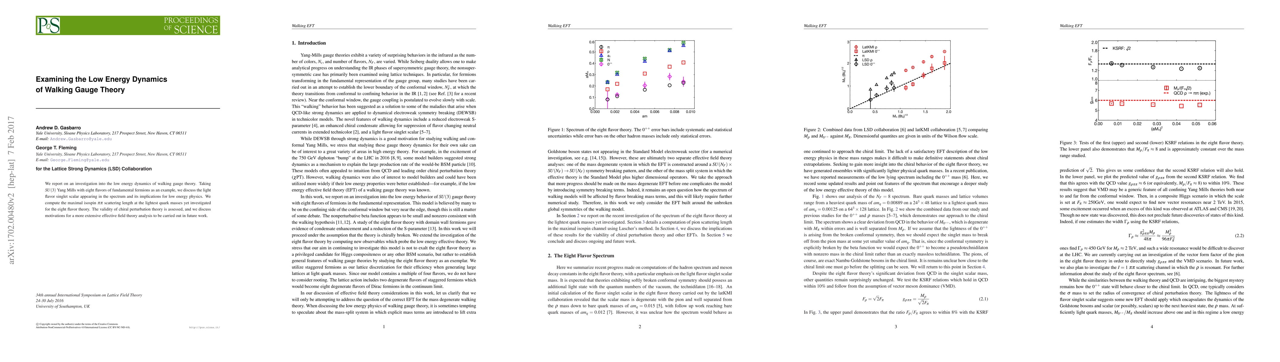 We report on an investigation into the low energy dynamics of walking gauge theory. Taking $SU(3)$ Yang Mills with eight flavors of fundamental fermions as an example, we discuss the light flavor singlet scalar appearing in the spectrum and its implications for low energy physics. We compute the maximal isospin $\pi\pi$ scattering length at the lightest quark masses yet investigated for the eight flavor theory. The validity of chiral perturbation theory is assessed, and we discuss motivations for a more extensive effective field theory analysis to be carried out in future work.