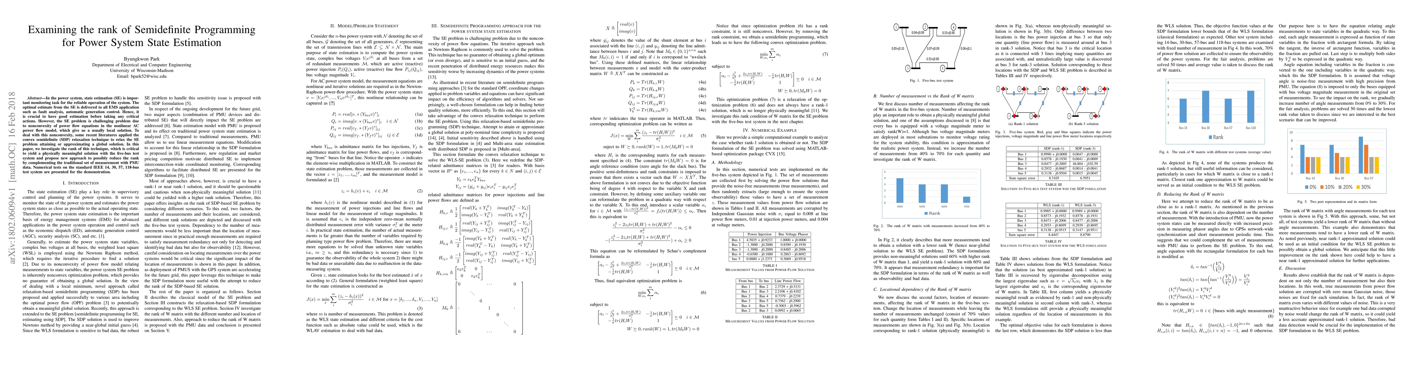 This research builds upon existing SDP applications for optimal power flow problems and extends them to power system state estimation, investigating the rank of the W matrix and its dependence on measurement number and location. It also explores the potential of PMU data to reduce the rank of W matrix and improve the quality of SDP-based SE solutions.