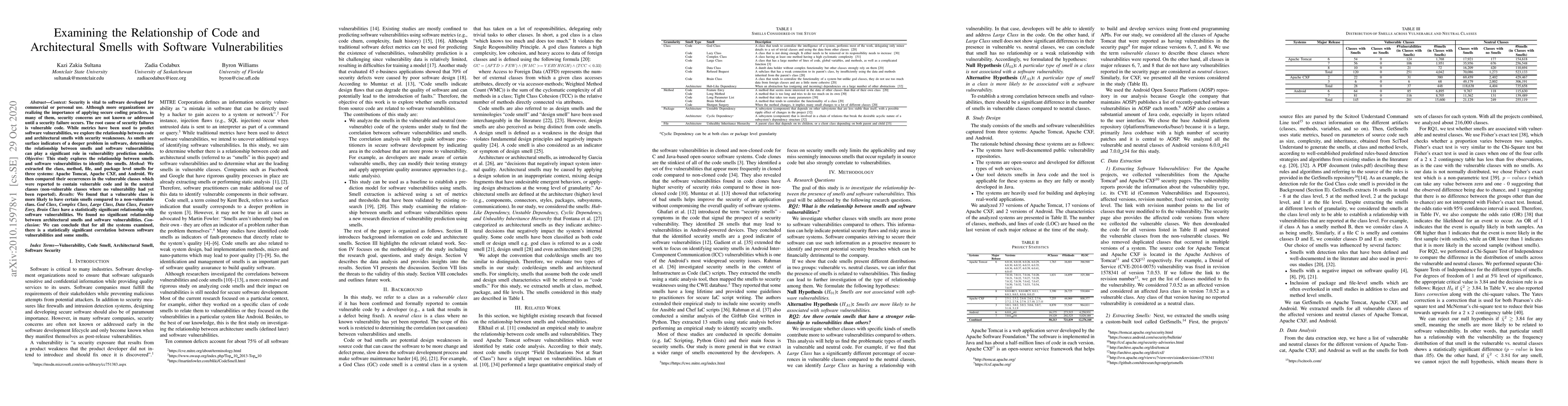 This study investigates the relationship between code and architectural smells and software vulnerabilities, finding that certain smells like God Class and Complex Class are statistically significant predictors of vulnerabilities. No significant relationship was found between architectural smells and vulnerabilities.