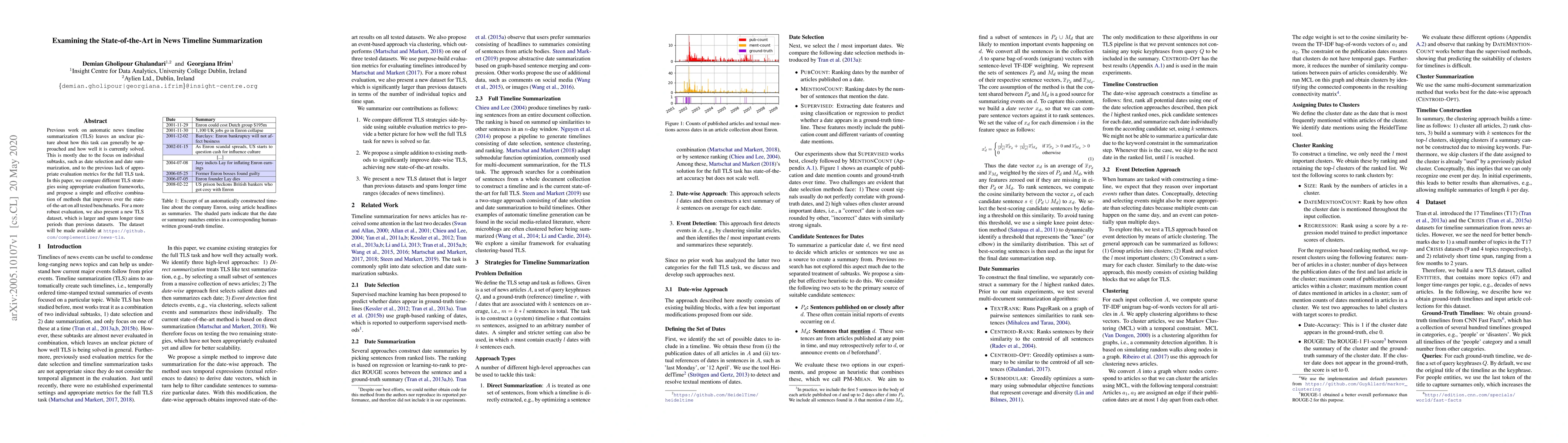 This paper evaluates various automatic news timeline summarization (TLS) strategies using improved evaluation metrics and introduces a new, larger TLS dataset. The authors propose a combined method that outperforms existing state-of-the-art approaches on multiple benchmarks.