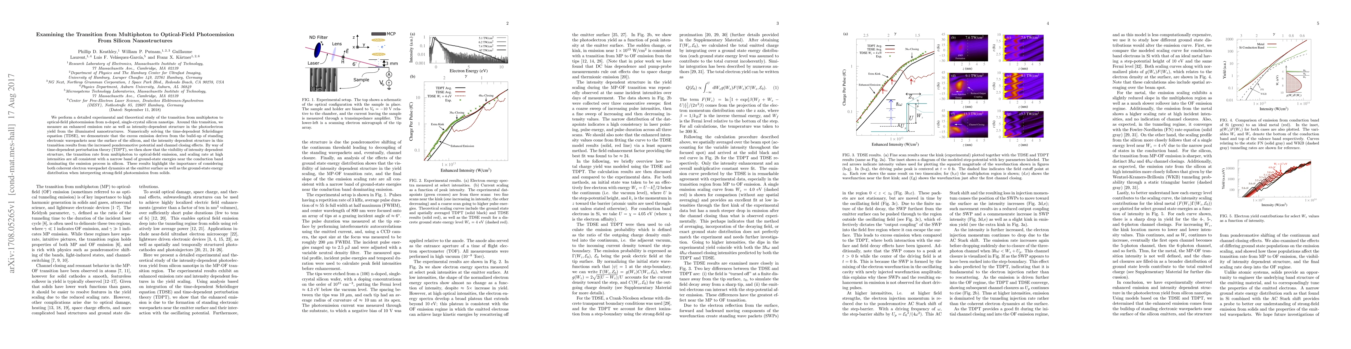 We perform a detailed experimental and theoretical study of the transition from multiphoton to optical-field photoemission from n-doped, single-crystal silicon nanotips. Around this transition, we measure an enhanced emission rate as well as intensity-dependent structure in the photoelectron yield from the illuminated nanostructures. Numerically solving the time-dependent Schr\"odinger equation (TDSE), we demonstrate that the excess emission derives from the build-up of standing electronic wavepackets near the surface of the silicon, and the intensity dependent structure in this transition results from the increased ponderomotive potential and channel closing effects. By way of time-dependent perturbation theory (TDPT), we then show that the visibility of intensity dependent structure, the transition rate from multiphoton to optical-field emission, and scaling rate at high intensities are all consistent with a narrow band of ground-state energies near the conduction band dominating the emission process in silicon. These results highlight the importance of considering both coherent electron wavepacket dynamics at the emitter surface as well as the ground-state energy distribution when interpreting strong-field photoemission from solids.