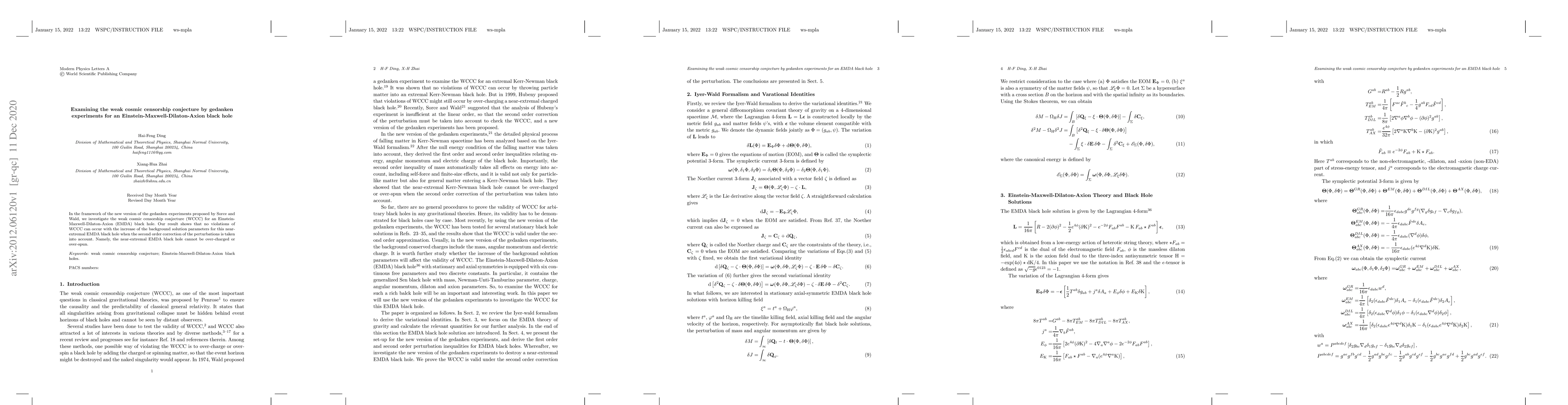 Summary: This study examines the weak cosmic censorship conjecture (WCCC) for an Einstein-Maxwell-Dilaton-Axion (EMDA) black hole using gedanken experiments. The results show that no violations of WCCC occur for near-extremal EMDA black holes when considering second-order perturbation corrections, indicating these black holes cannot be over-charged or over-spun.