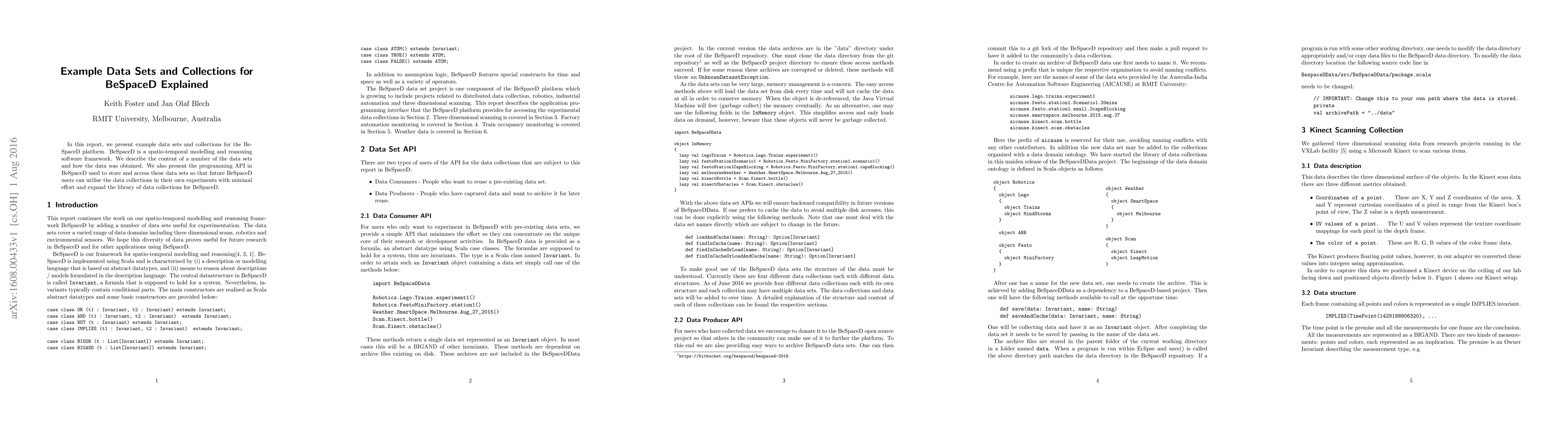 In this report, we present example data sets and collections for the BeSpaceD platform. BeSpaceD is a spatio-temporal modelling and reasoning software framework. We describe the content of a number of the data sets and how the data was obtained. We also present the programming API in BeSpaceD used to store and access these data sets so that future BeSpaceD users can utilise the data collections in their own experiments with minimal effort and expand the library of data collections for BeSpaceD.