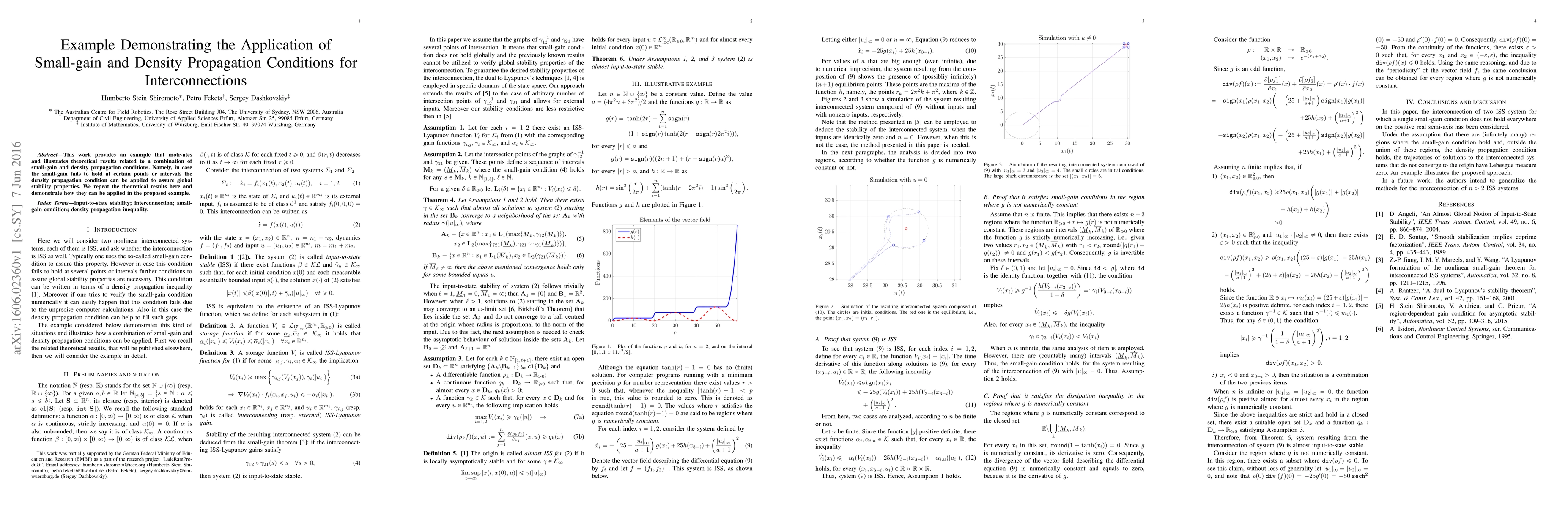 This work provides an example that motivates and illustrates theoretical results related to a combination of small-gain and density propagation conditions. Namely, in case the small-gain fails to hold at certain points or intervals the density propagation condition can be applied to assure global stability properties. We repeat the theoretical results here and demonstrate how they can be applied in the proposed example.