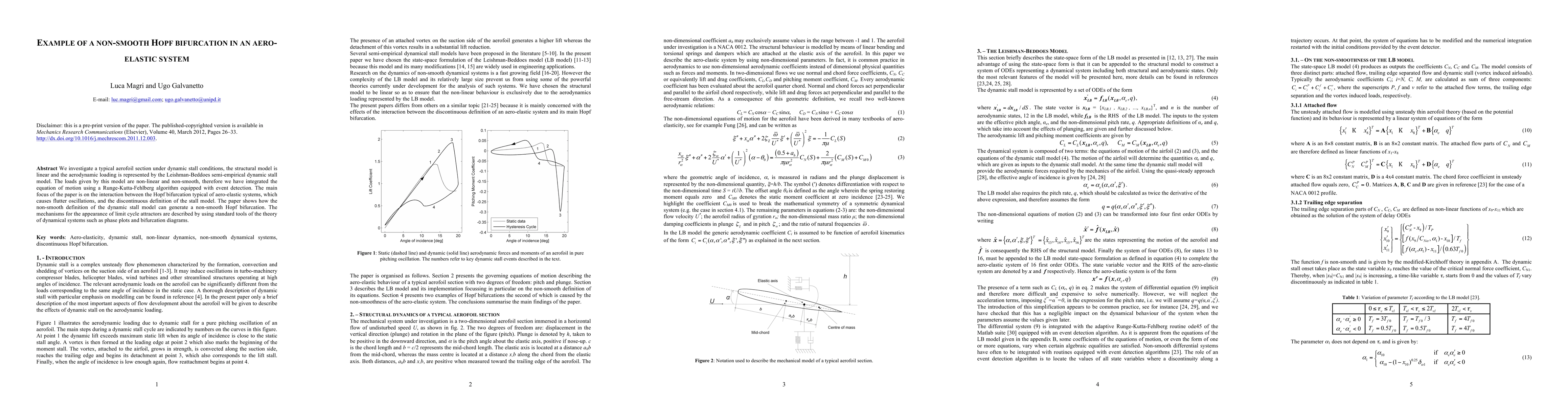 We investigate a typical aerofoil section under dynamic stall conditions, the structural model is linear and the aerodynamic loading is represented by the Leishman-Beddoes semi-empirical dynamic stall model. The loads given by this model are non-linear and non-smooth, therefore we have integrated the equation of motion using a Runge-Kutta-Fehlberg algorithm equipped with event detection. The main focus of the paper is on the interaction between the Hopf bifurcation typical of aero-elastic systems, which causes flutter oscillations, and the discontinuous definition of the stall model. The paper shows how the non-smooth definition of the dynamic stall model can generate a non-smooth Hopf bifurcation. The mechanisms for the appearance of limit cycle attractors are described by using standard tools of the theory of dynamical systems such as phase plots and bifurcation diagrams.