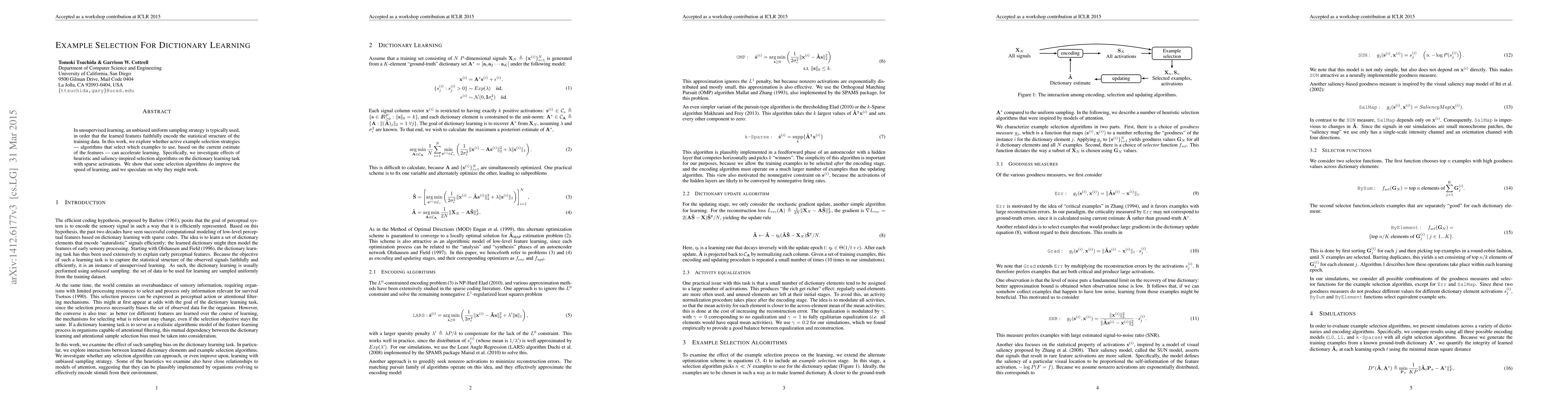 In unsupervised learning, an unbiased uniform sampling strategy is typically used, in order that the learned features faithfully encode the statistical structure of the training data. In this work, we explore whether active example selection strategies - algorithms that select which examples to use, based on the current estimate of the features - can accelerate learning. Specifically, we investigate effects of heuristic and saliency-inspired selection algorithms on the dictionary learning task with sparse activations. We show that some selection algorithms do improve the speed of learning, and we speculate on why they might work.