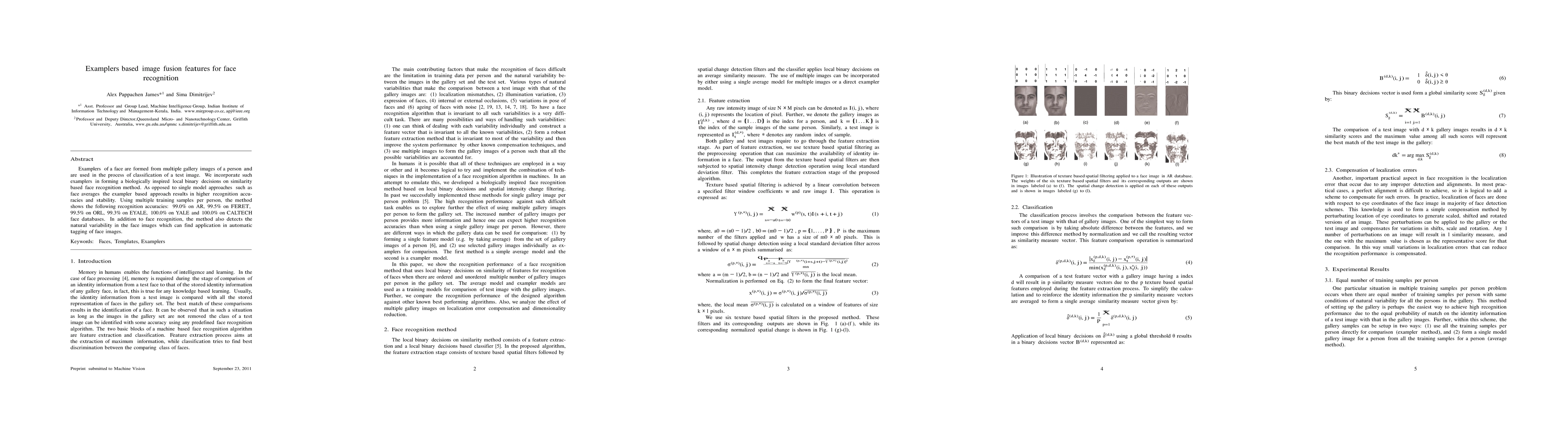 Examplers of a face are formed from multiple gallery images of a person and are used in the process of classification of a test image. We incorporate such examplers in forming a biologically inspired local binary decisions on similarity based face recognition method. As opposed to single model approaches such as face averages the exampler based approach results in higher recognition accu- racies and stability. Using multiple training samples per person, the method shows the following recognition accuracies: 99.0% on AR, 99.5% on FERET, 99.5% on ORL, 99.3% on EYALE, 100.0% on YALE and 100.0% on CALTECH face databases. In addition to face recognition, the method also detects the natural variability in the face images which can find application in automatic tagging of face images.