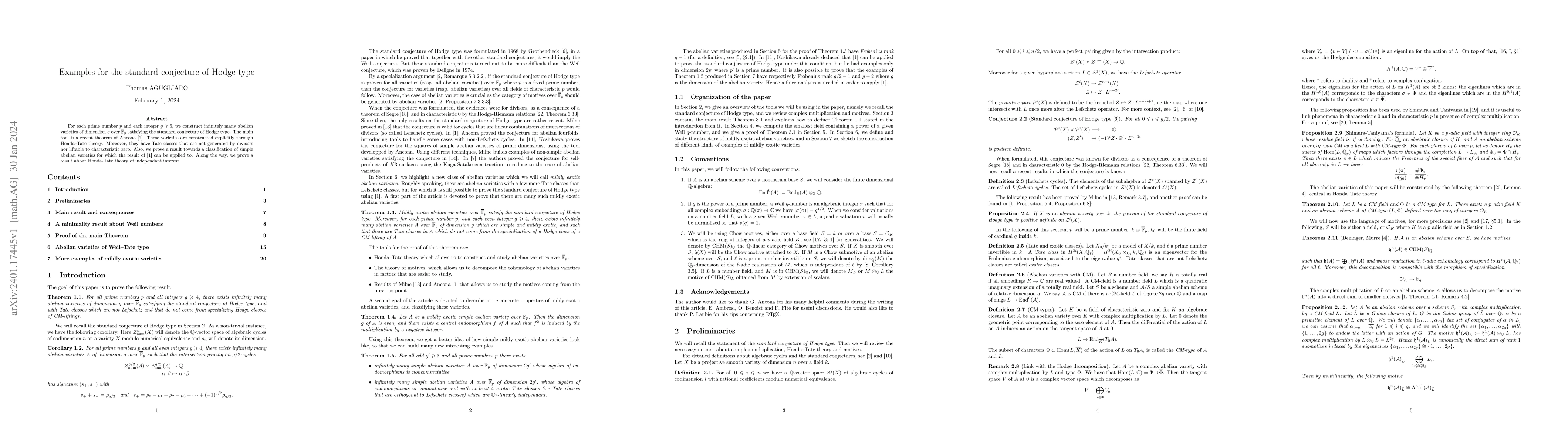 For each prime number $p$ and each integer $g \geqslant 5$, we construct infinitely many abelian varieties of dimension $g$ over $\overline{\mathbb{F}}_p$ satisfying the standard conjecture of Hodge type. The main tool is a recent theorem of Ancona on certain rank $2$ motives. These varieties are constructed explicitly through Honda-Tate theory. Moreover, they have Tate classes that are not generated by divisors nor liftable to characteristic zero. Also, we prove a result towards a classification of simple abelian varieties for which the result of Ancona can be applied to. Along the way, we prove a result about Honda-Tate theory of independant interest.