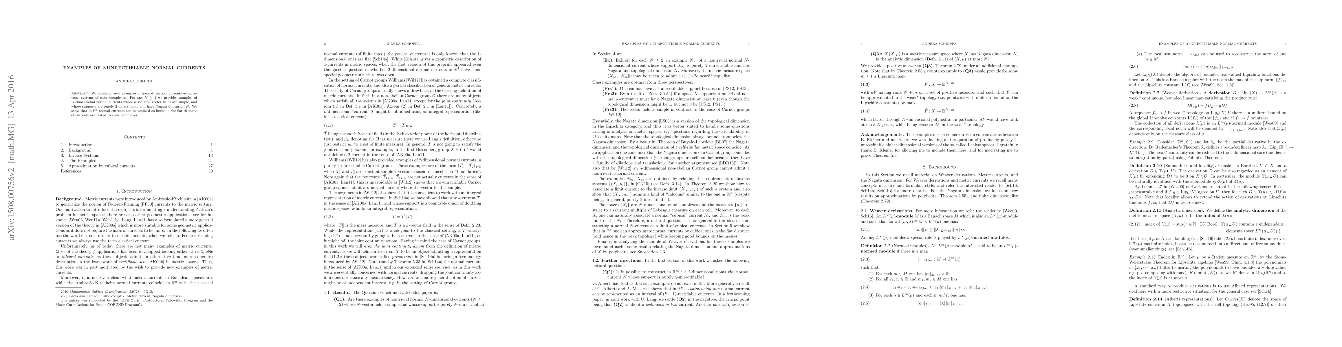 We construct new examples of normal (metric) currents using inverse systems of cube complexes. For any $N\ge 2$ we provide examples of $N$-dimensional normal currents whose associated vector fields are simple, and whose supports are purely $2$-unrectifiable and have Nagata dimension $N$. We show that in $l^\infty$ normal currents can be realized as limits in the flat distance of currents associated to cube complexes.