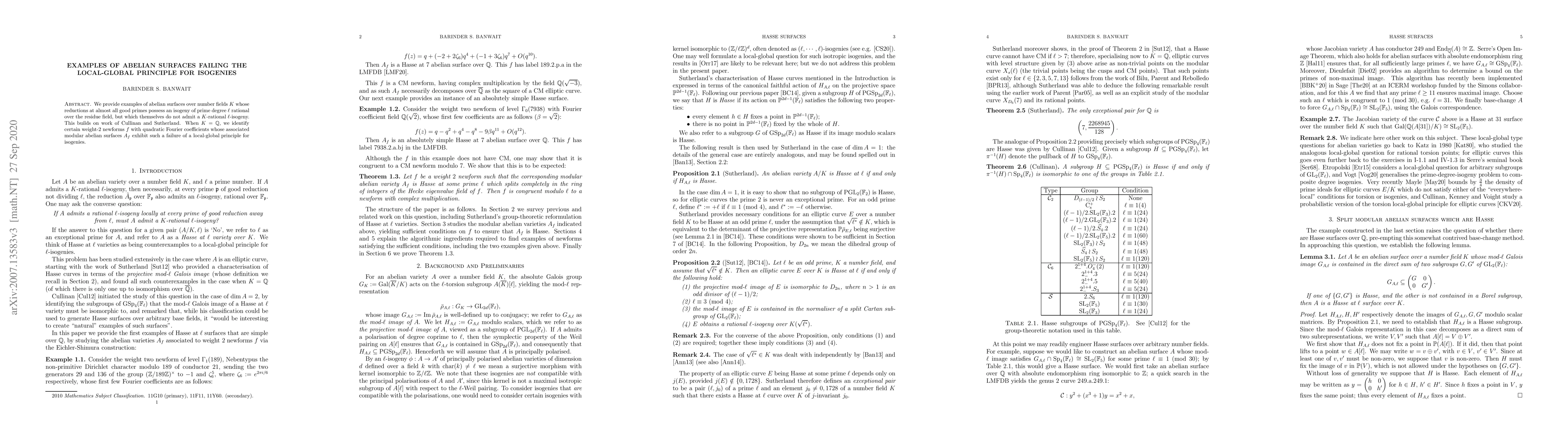 Summary: The paper presents abelian surfaces over number fields that fail the local-global principle for isogenies, showing reductions at almost all good primes admit prime degree isogenies over residue fields, while the surfaces themselves lack $K$-rational $\ell$-isogenies. Special cases over $\mathbb{Q}$ involve weight-$2$ newforms with quadratic Fourier coefficients and associated modular abelian surfaces demonstrating this failure.
