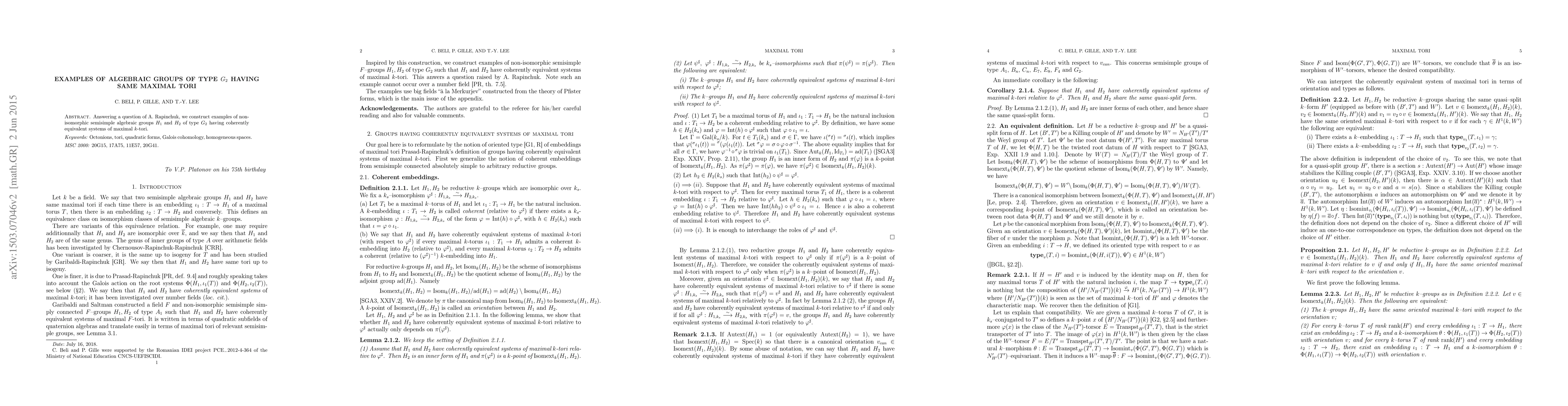 Answering a question of A. Rapinchuk, we construct examples of non- isomorphic semisimple algebraic groups H1 and H2 of type G2 with coherently equivalent systems of maximal k-tori.