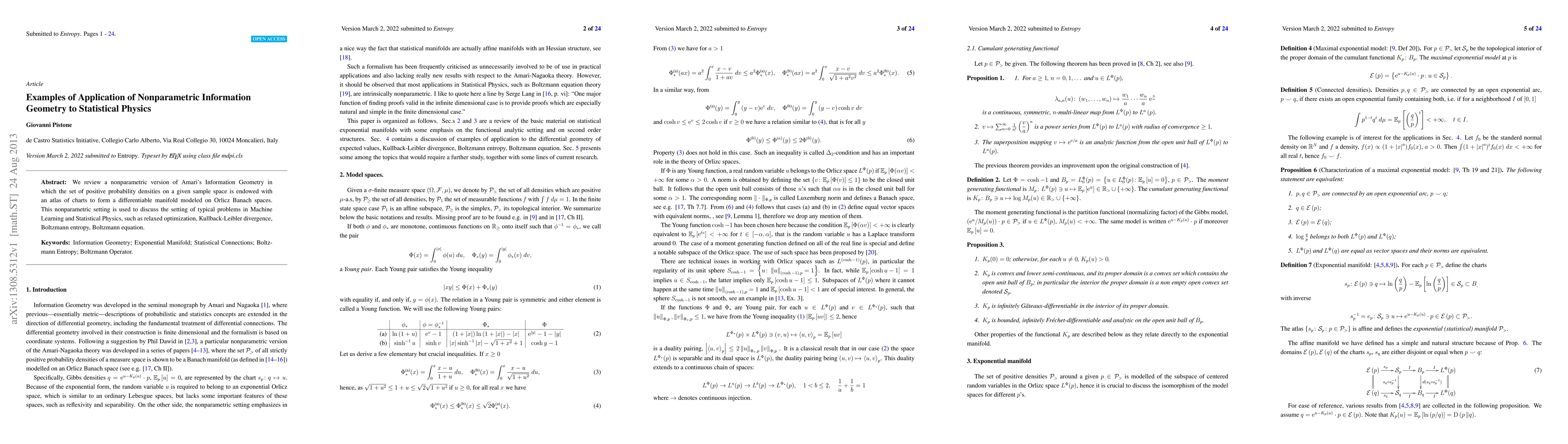This paper reviews a nonparametric version of Amari's Information Geometry, applying it to statistical physics and machine learning contexts. It utilizes an atlas of charts to model a differentiable manifold for positive probability densities, discussing concepts like relaxed optimization and Boltzmann entropy.