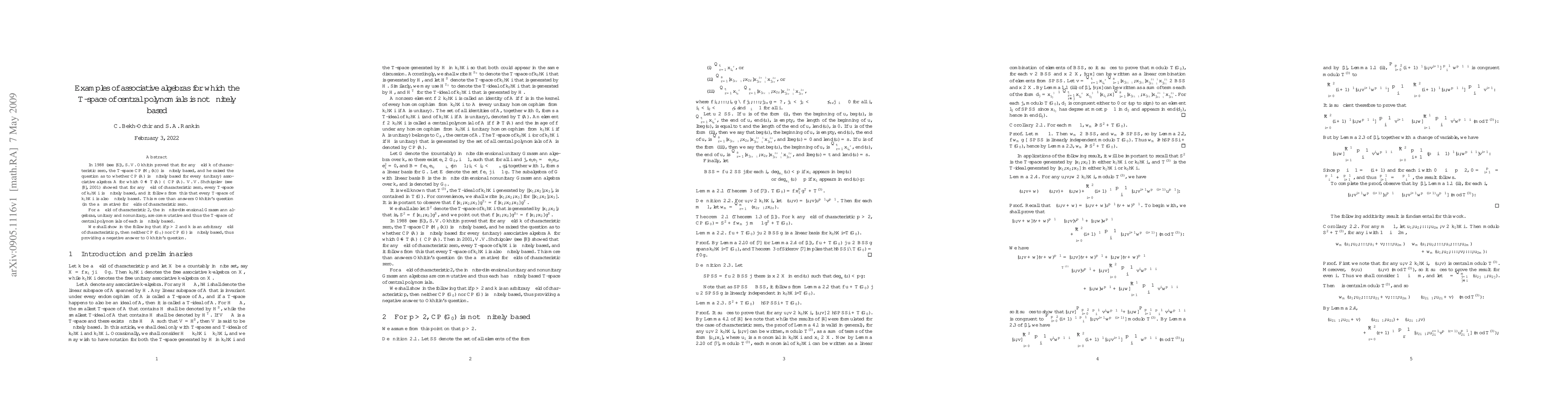 In 1988, S. V. Okhitin proved that for any field k of characteristic zero, the T-space CP(M_2(k)) is finitely based, and he raised the question as to whether CP(A) is finitely based for every (unitary) associative algebra A with nonzero T-ideal of identities that is properly contained CP(A). V. V. Shchigolev (2001) showed that for any field k of characteristic zero, every T-space of the infinite dimensional free associative k algebra is finitely based, and it follows from this that every T-space of the infinite dimensional free unitary k algebra is also finitely based. This more than answers Okhitin's question (in the affirmative) for fields of characteristic zero. For a field of characteristic 2, the infinite-dimensional Grassmann algebras, unitary and nonunitary, are commutative and thus the T-space of central polynomials of each is finitely based. We shall show in the following that if p is a prime greater than 2 and k is an arbitrary field of characteristic p, then the T-space of central polynomials of the infinite dimension free (unitary or otherwise) associative algebra is finitely based, thus providing a negative answer to Okhitin's question.