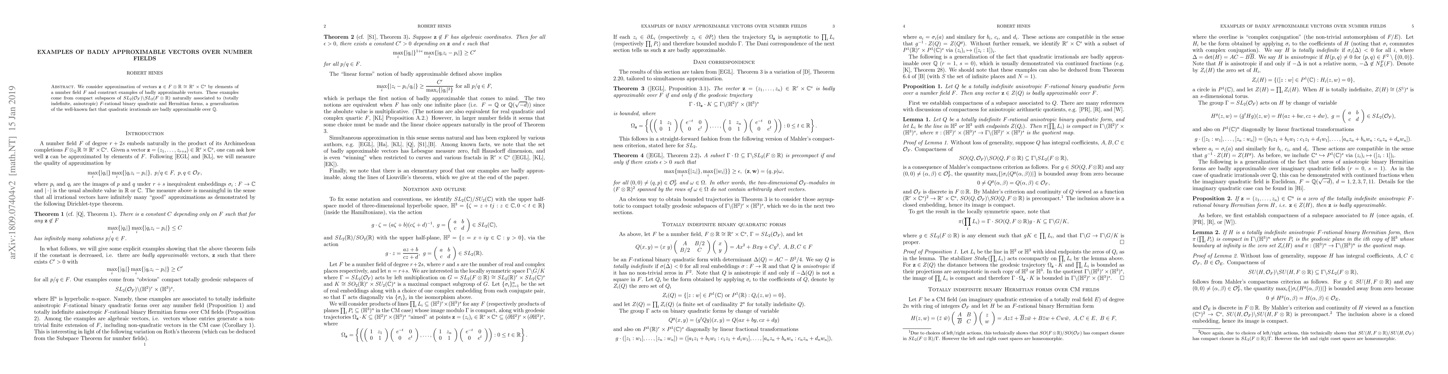 We consider approximation of vectors $\mathbf{z}\in F\otimes\mathbb{R}\cong\mathbb{R}^r\times\mathbb{C}^s$ by elements of a number field $F$ and construct examples of badly approximable vectors. These examples come from compact subspaces of $SL_2(\mathcal{O}_F)\backslash SL_2(F\otimes\mathbb{R})$ naturally associated to (totally indefinite, anisotropic) $F$-rational binary quadratic and Hermitian forms, a generalization of the well-known fact that quadratic irrationals are badly approximable over $\mathbb{Q}$.