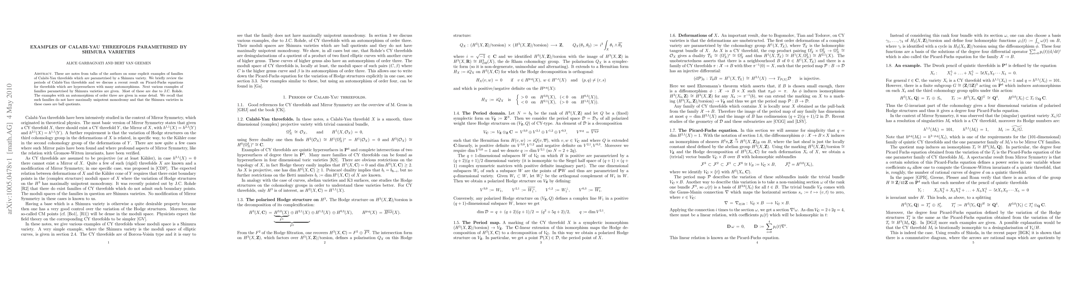This paper provides explicit examples of Calabi-Yau threefolds parametrized by Shimura varieties, reviewing their periods and discussing recent results on their Picard-Fuchs equations. It details examples, particularly those with an automorphism of order three, and notes that these families do not exhibit maximally unipotent monodromy.