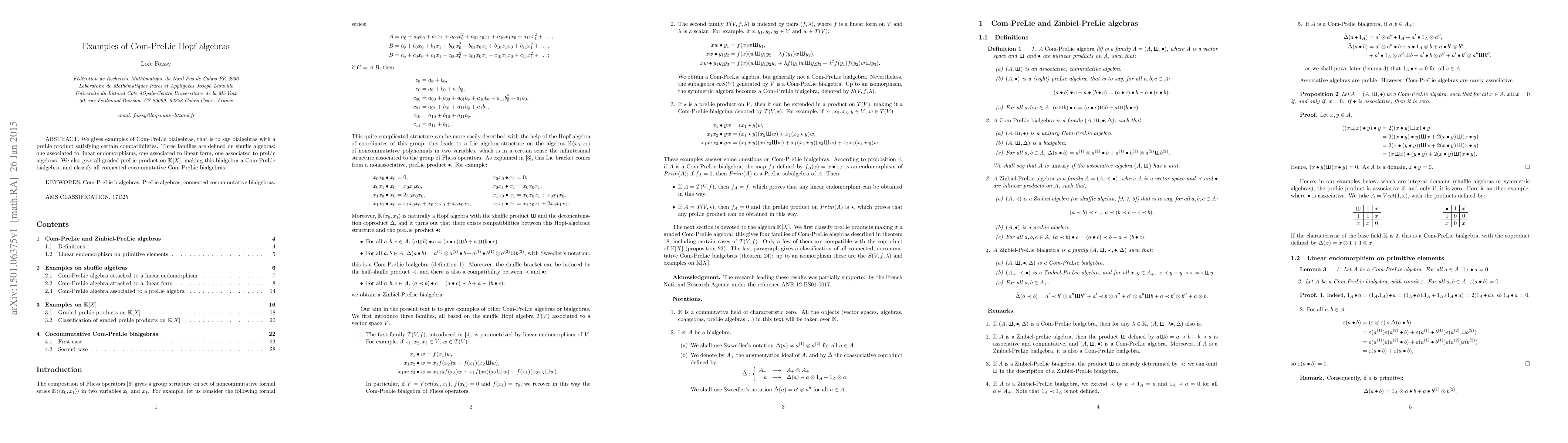 This paper provides examples of Com-PreLie bialgebras, specifically on shuffle algebras, and classifies all connected cocommutative instances. It defines three families of bialgebras and details the graded preLie product on K[X].
