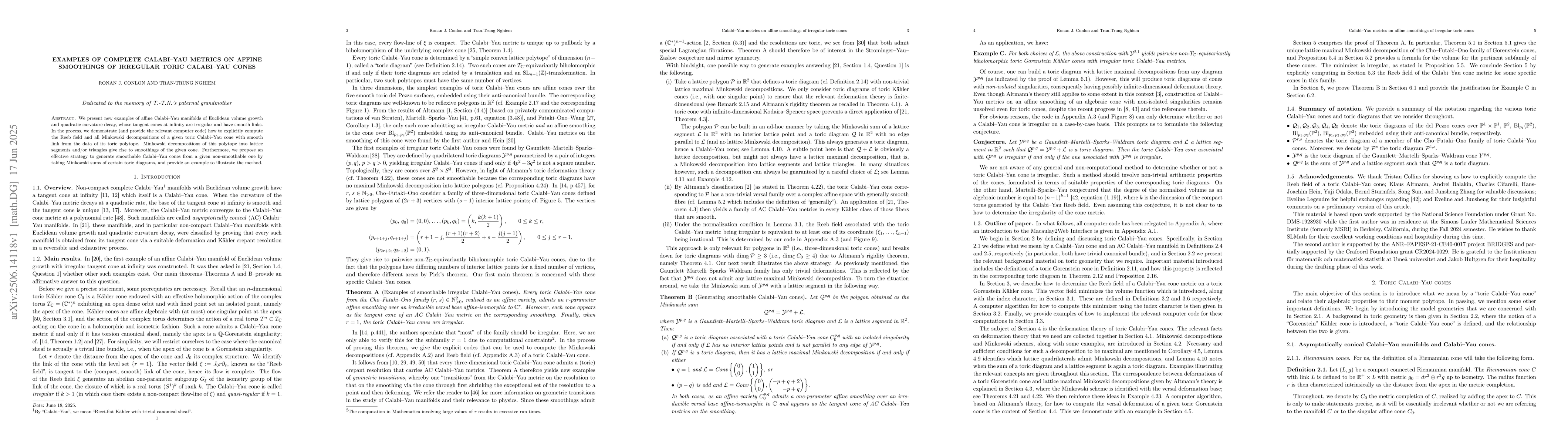 We present new examples of affine Calabi--Yau manifolds of Euclidean volume growth and quadratic curvature decay, whose tangent cones at infinity are irregular and have smooth links. In the process, we demonstrate (and provide the relevant computer code) how to explicitly compute the Reeb field and all Minkowski decompositions of a given toric Calabi--Yau cone with smooth link from the data of its toric polytope. Minkowski decompositions of this polytope into lattice segments and/or triangles give rise to smoothings of the given cone. Furthermore, we propose an effective strategy to generate smoothable Calabi--Yau cones from a given non-smoothable one by taking Minkowski sums of certain toric diagrams, and provide an example to illustrate the method.