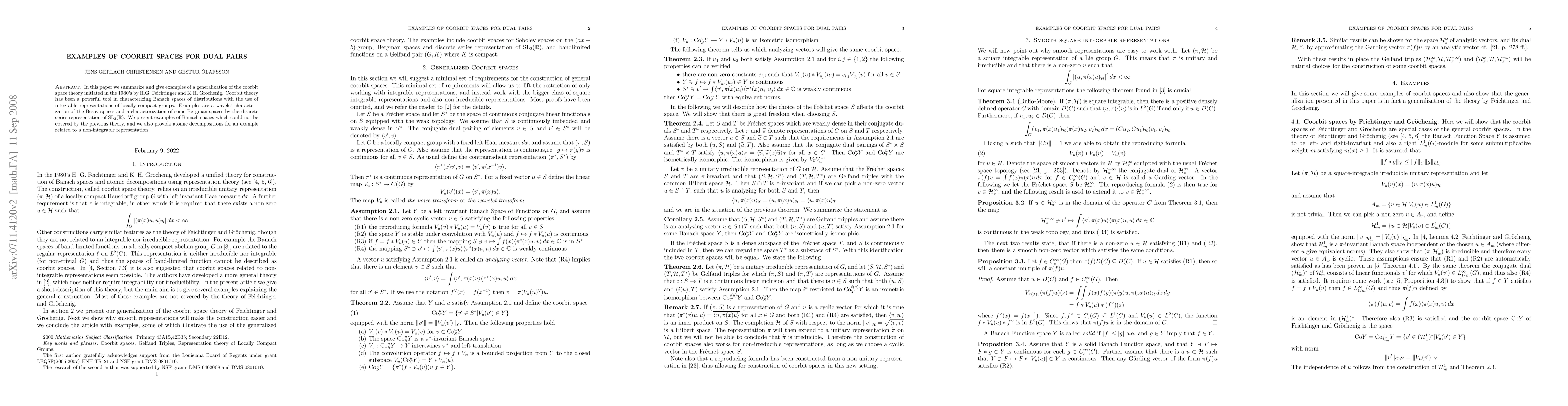 In this paper we summarize and give examples of a generalization of the coorbit space theory initiated in the 1980's by H.G. Feichtinger and K.H. Gr\"ochenig. Coorbit theory has been a powerful tool in characterizing Banach spaces of distributions with the use of integrable representations of locally compact groups. Examples are a wavelet characterization of the Besov spaces and a characterization of some Bergman spaces by the discrete series representation of $\mathrm{SL}_2(\mathbb{R})$. We present examples of Banach spaces which could not be covered by the previous theory, and we also provide atomic decompositions for an example related to a non-integrable representation.