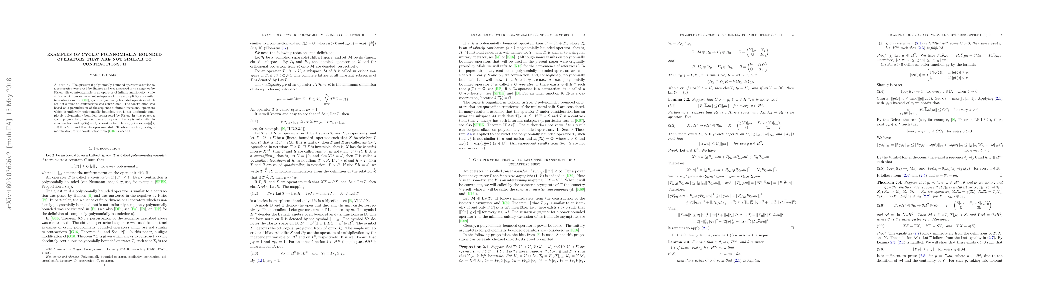 This paper constructs a cyclic polynomially bounded operator $T_0$ that is not similar to a contraction but whose restrictions on finite multiplicity invariant subspaces are similar to contractions. The construction employs a modified approach from a previous work, differing in the handling of the operator's perturbation to achieve the desired properties.