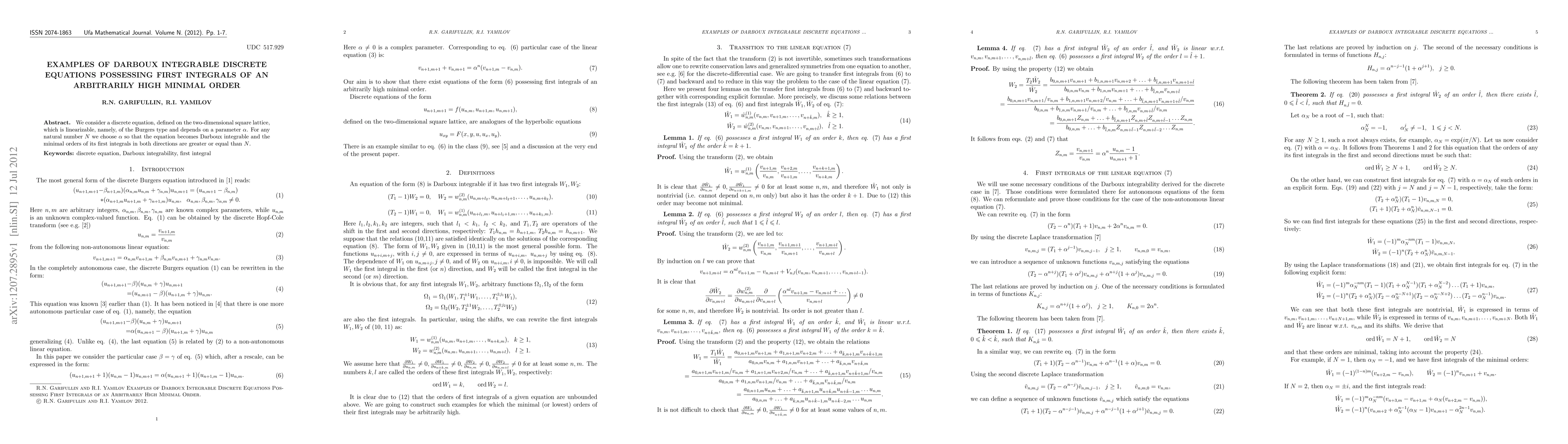 We consider a discrete equation, defined on the two-dimensional square lattice, which is linearizable, namely, of the Burgers type and depends on a parameter $\alpha$. For any natural number $N$ we choose $\alpha$ so that the equation becomes Darboux integrable and the minimal orders of its first integrals in both directions are greater or equal than $N$.