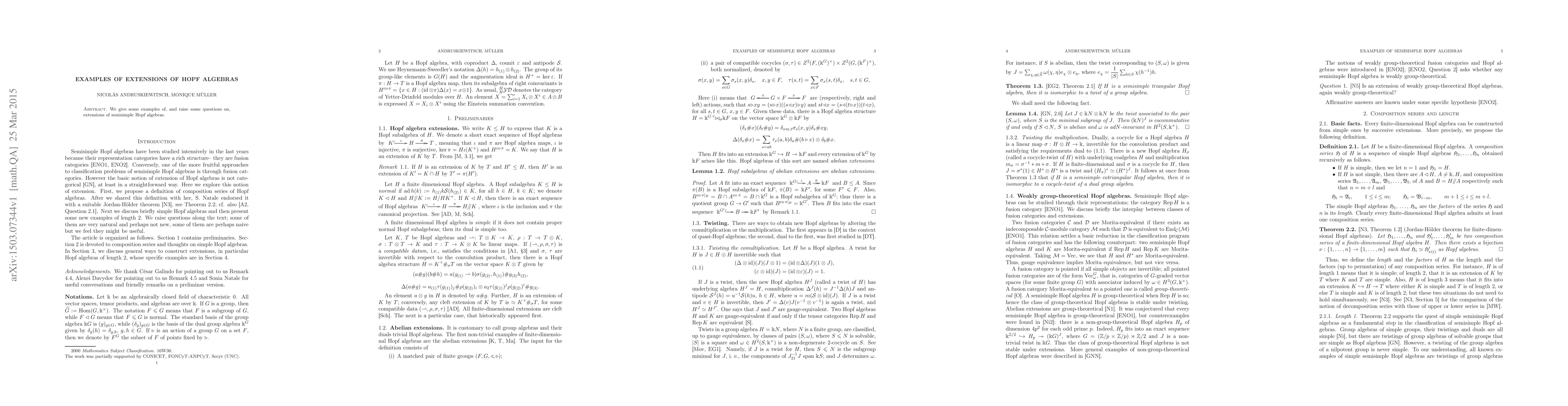 Summary: The paper presents illustrative examples of extensions of semisimple Hopf algebras and poses several open questions regarding these extensions, contributing to the ongoing exploration of their structure and properties.