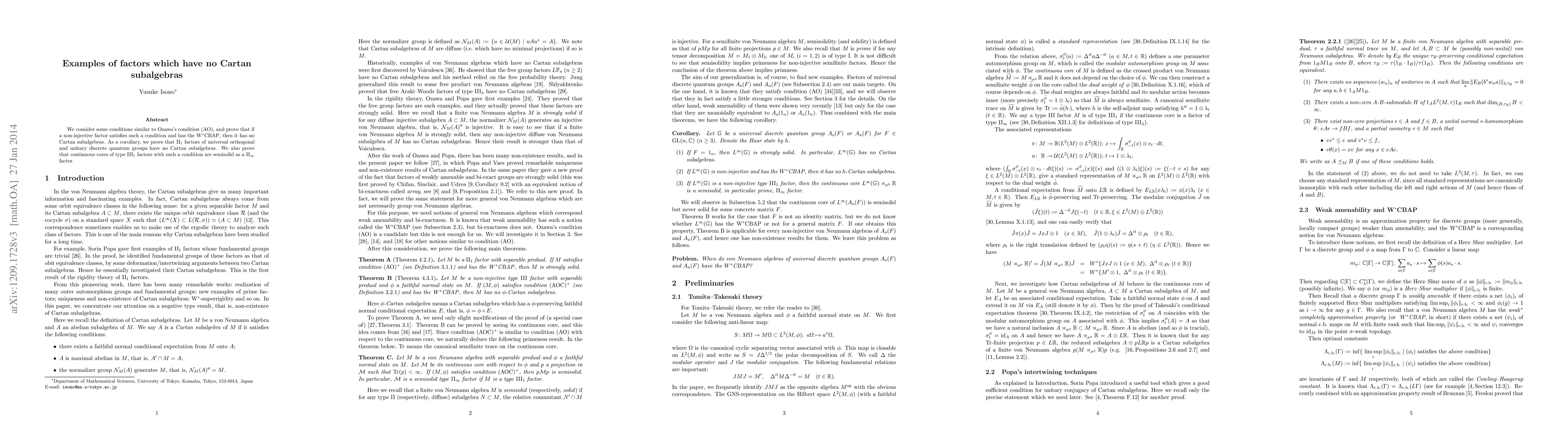 This paper demonstrates that non-injective factors meeting certain conditions, specifically those akin to Ozawa's condition (AO) and possessing the W*CBAP, lack Cartan subalgebras. It further concludes that $\rm II_1$ factors from universal orthogonal and unitary discrete quantum groups and type $\rm III_1$ factors' continuous cores exhibit no Cartan subalgebras.