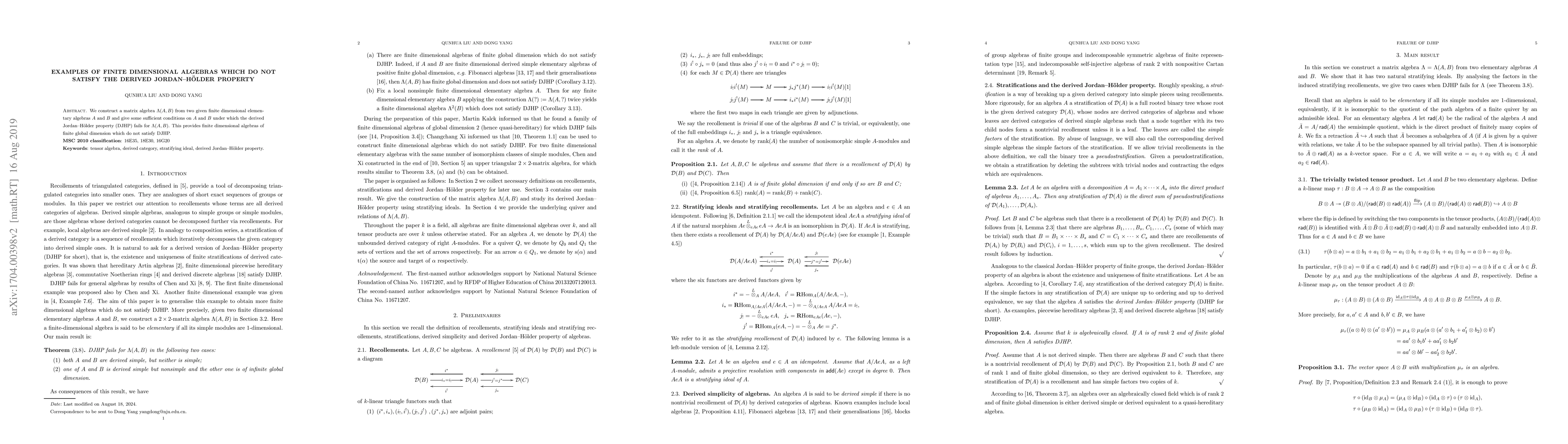 Summary: The paper constructs a matrix algebra from two finite-dimensional elementary algebras and identifies conditions under which it fails to satisfy the derived Jordan-Hölder property, demonstrating finite dimensional algebras of finite global dimension lacking this property.