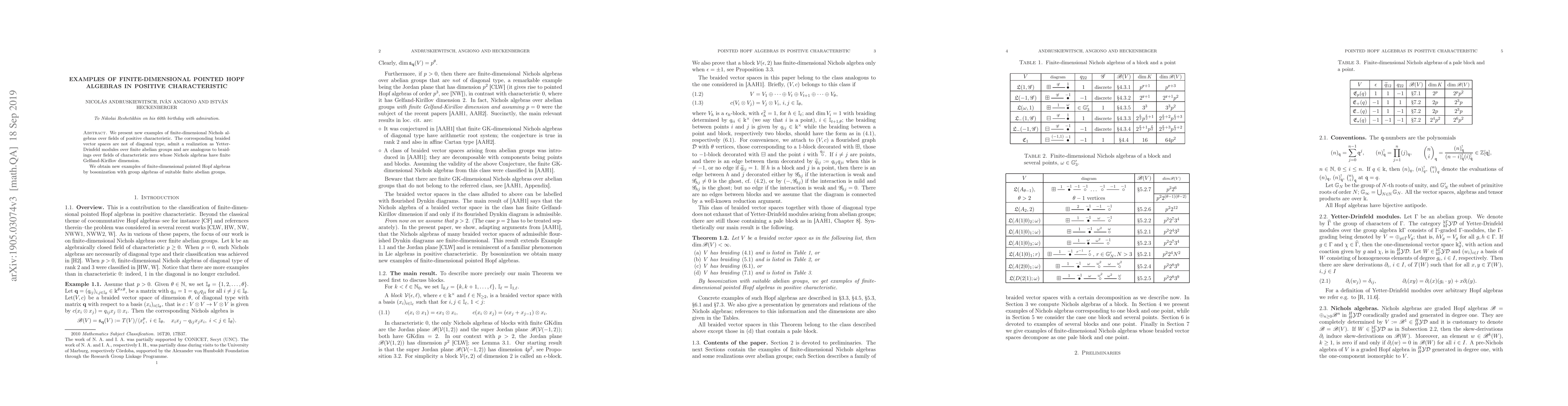 This paper introduces new finite-dimensional Nichols algebras in positive characteristic, which correspond to non-diagonal type braided vector spaces and can be realized as Yetter-Drinfeld modules over finite abelian groups. These examples lead to new finite-dimensional pointed Hopf algebras through bosonization with group algebras.