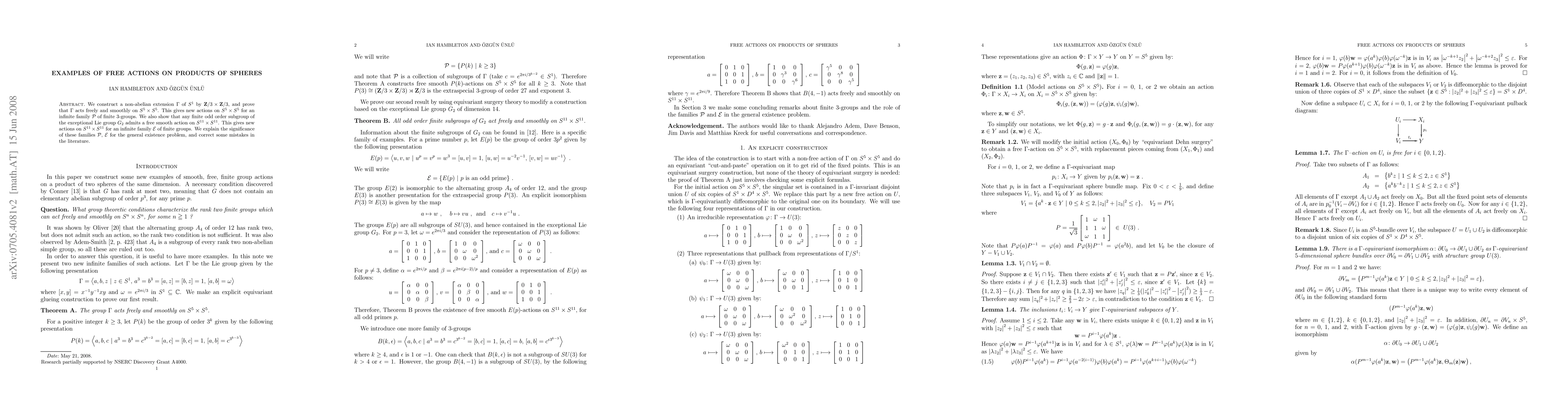 We construct a non-abelian extension $\Gamma$ of $S^1$ by $\cy 3 \times \cy 3$, and prove that $\Gamma$ acts freely and smoothly on $S^{5} \times S^{5}$. This gives new actions on $S^{5} \times S^{5}$ for an infinite family $\cP$ of finite 3-groups. We also show that any finite odd order subgroup of the exceptional Lie group $G_2$ admits a free smooth action on $S^{11}\times S^{11}$. This gives new actions on $S^{11}\times S^{11}$ for an infinite family $\cE $ of finite groups. We explain the significance of these families $\cP $, $\cE $ for the general existence problem, and correct some mistakes in the literature.