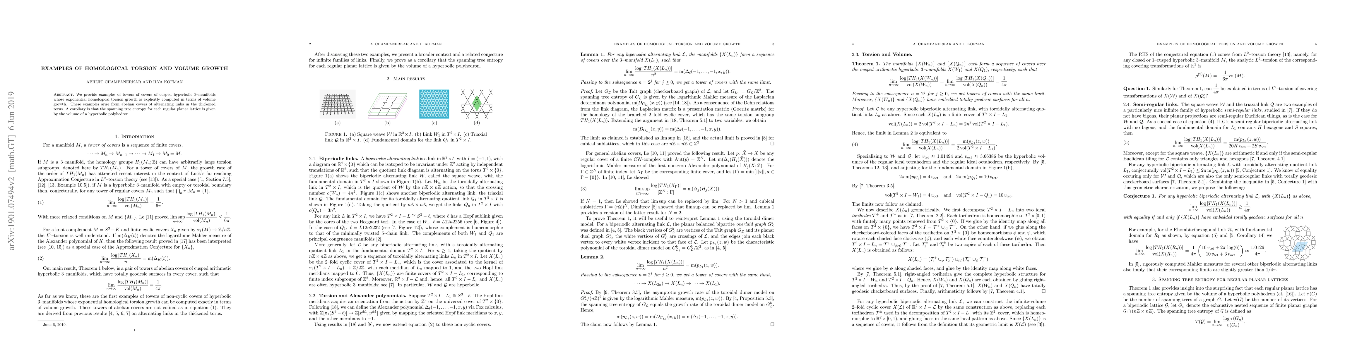 This paper examines towers of covers of cusped hyperbolic 3-manifolds, explicitly linking exponential homological torsion growth to volume growth through abelian covers of alternating links in the thickened torus. It concludes that the spanning tree entropy for regular planar lattices corresponds to the volume of a hyperbolic polyhedron.