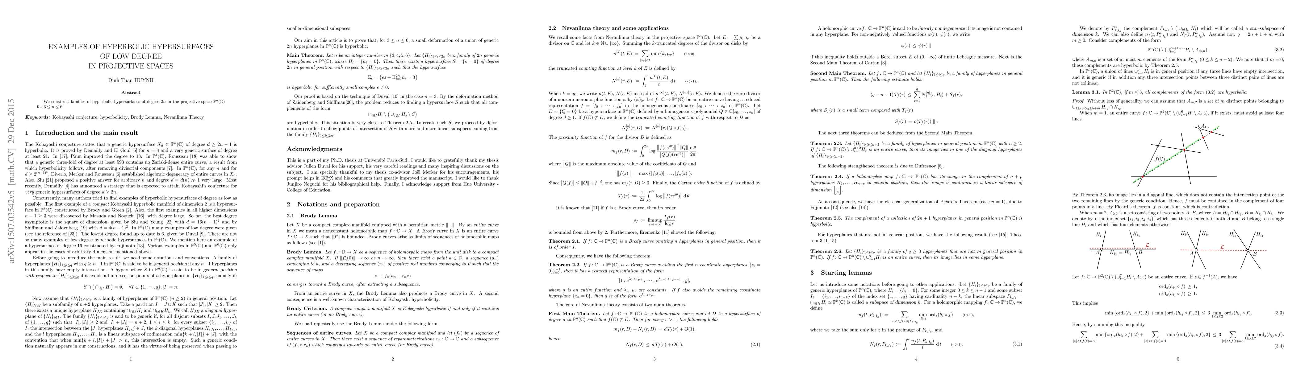 This paper constructs families of hyperbolic hypersurfaces of degree $2n$ in complex projective spaces $\mathbb{P}^n(\mathbb{C})$ for dimensions $n$ ranging from 3 to 6. The focus is on demonstrating the existence of such low-degree hyperbolic hypersurfaces.