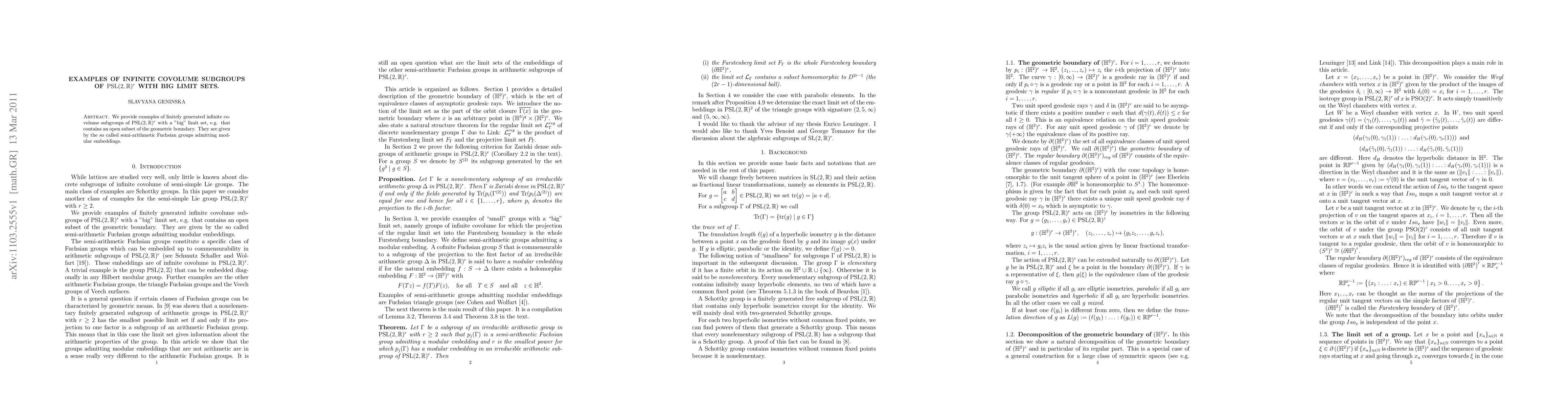 We provide examples of finitely generated infinite covolume subgroups of $PSL(2,R)^r$ with a "big" limit set, e.g. that contains an open subset of the geometric boundary. They are given by the so called semi-arithmetic Fuchsian groups admitting modular embeddings.