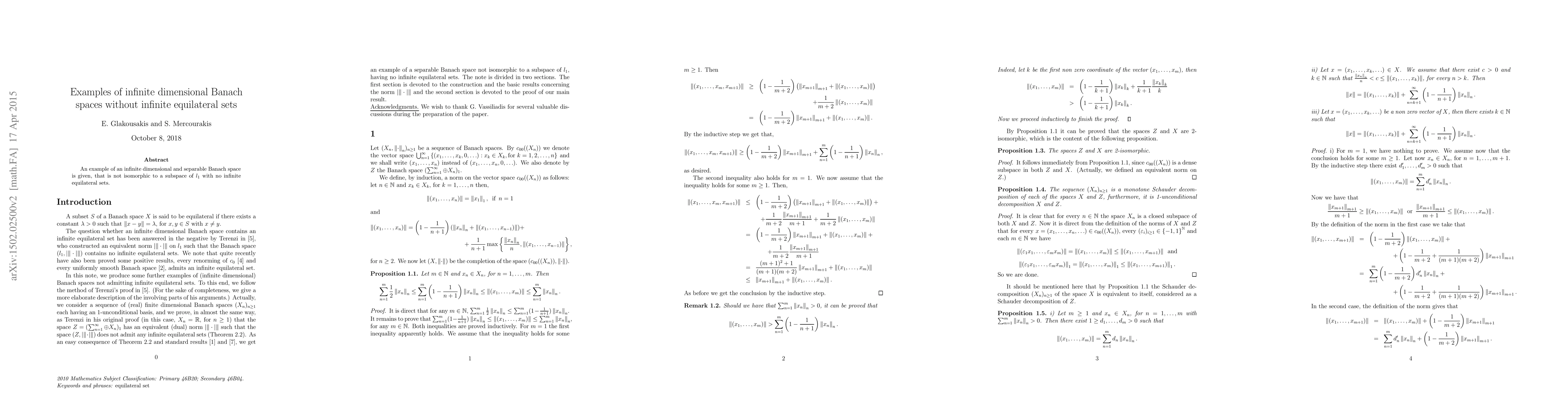 Summary: The paper presents an example of an infinite dimensional, separable Banach space that lacks infinite equilateral sets and is not isomorphic to any subspace of l1. This demonstrates the existence of such spaces beyond those typically considered.