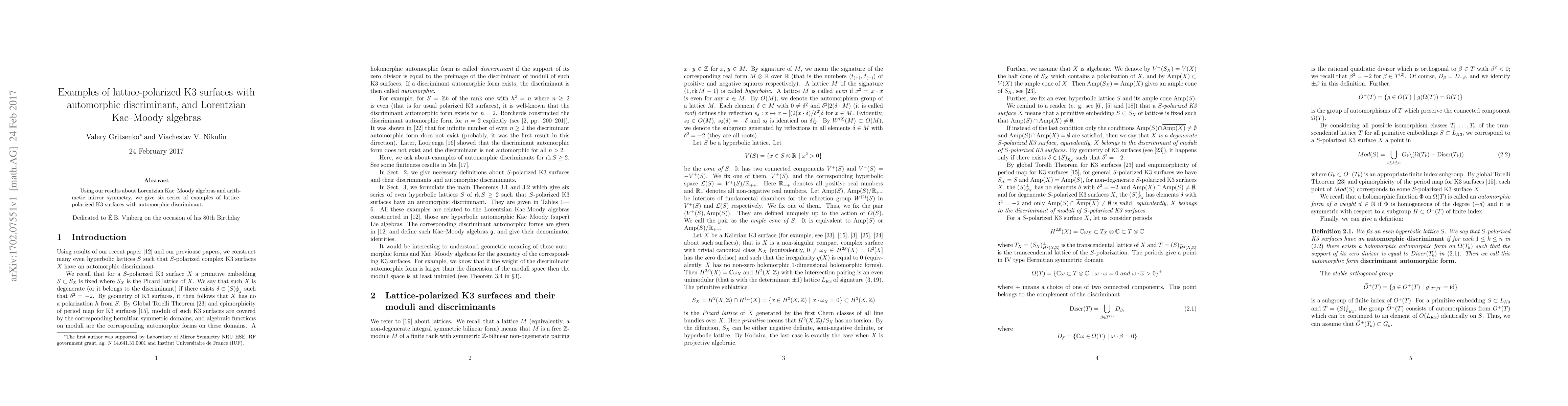 Summary: This paper presents six series of lattice-polarized K3 surfaces featuring automorphic discriminants, leveraging results from Lorentzian Kac-Moody algebras and arithmetic mirror symmetry.