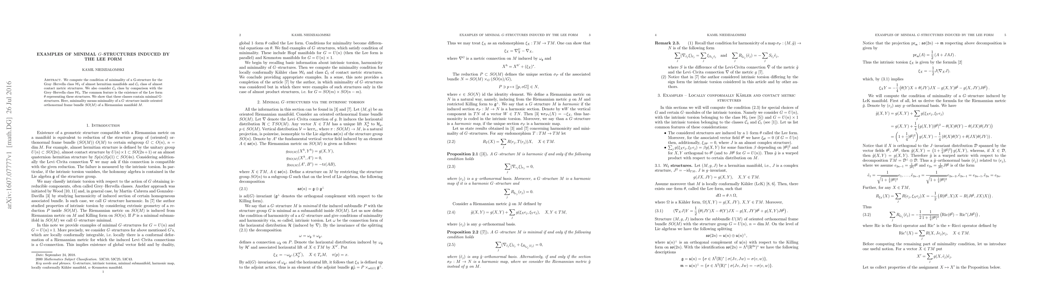 We compute the condition of minimality of a G-structure for the Gray-Hervella class $\mathcal{W}_4$ of almost hermitian manifolds and $\mathcal{C}_5$ class of almost contact metric structures. We also consider $\mathcal{C}_4$ class by comparison with the Grey-Hervella class $\mathcal{W}_4$. The common feature is the existence of the Lee form $\theta$ representing these structures. We show that these classes contain minimal G-structures. Here, minimality means minimality of a $G$-structure inside oriented orthonormal frame bundle $SO(M)$ of a Riemannian manifold $M$.