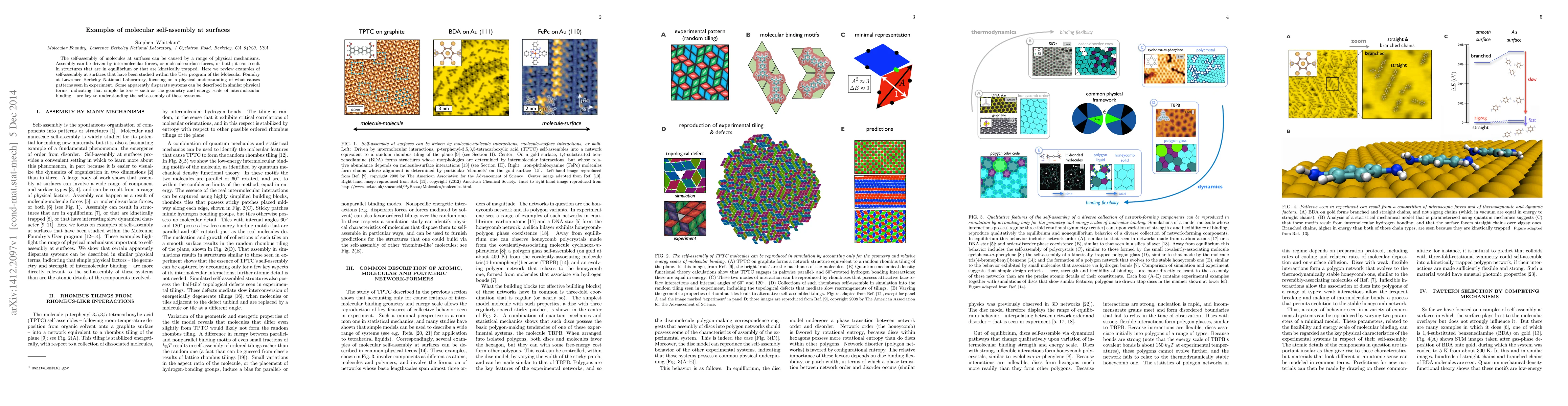 This paper reviews molecular self-assembly at surfaces, emphasizing the physical mechanisms driving these processes, and highlights how simple factors like intermolecular binding geometry and energy scale are key to understanding diverse self-assembly systems. The study focuses on experimental patterns observed at the Molecular Foundry, Lawrence Berkeley National Laboratory.
