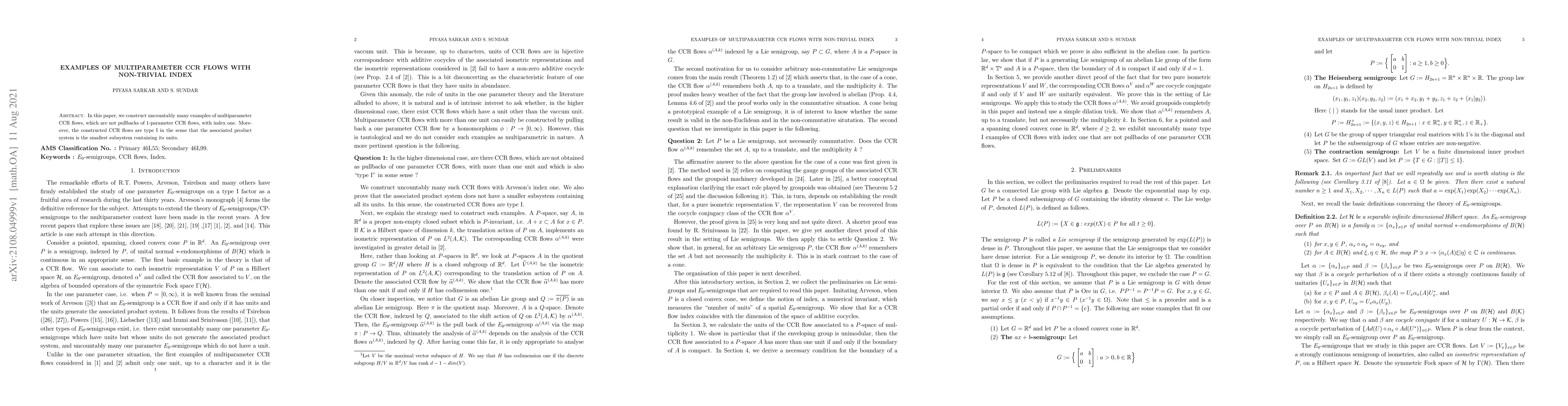 This paper constructs uncountably many multiparameter CCR flows with a non-trivial index of one, which are not derived from 1-parameter CCR flows. These flows are type I, characterized by having the smallest subsystem containing their units.